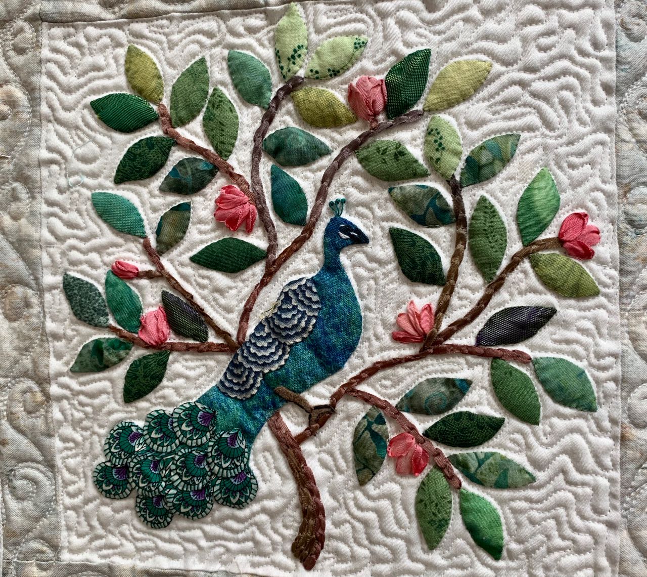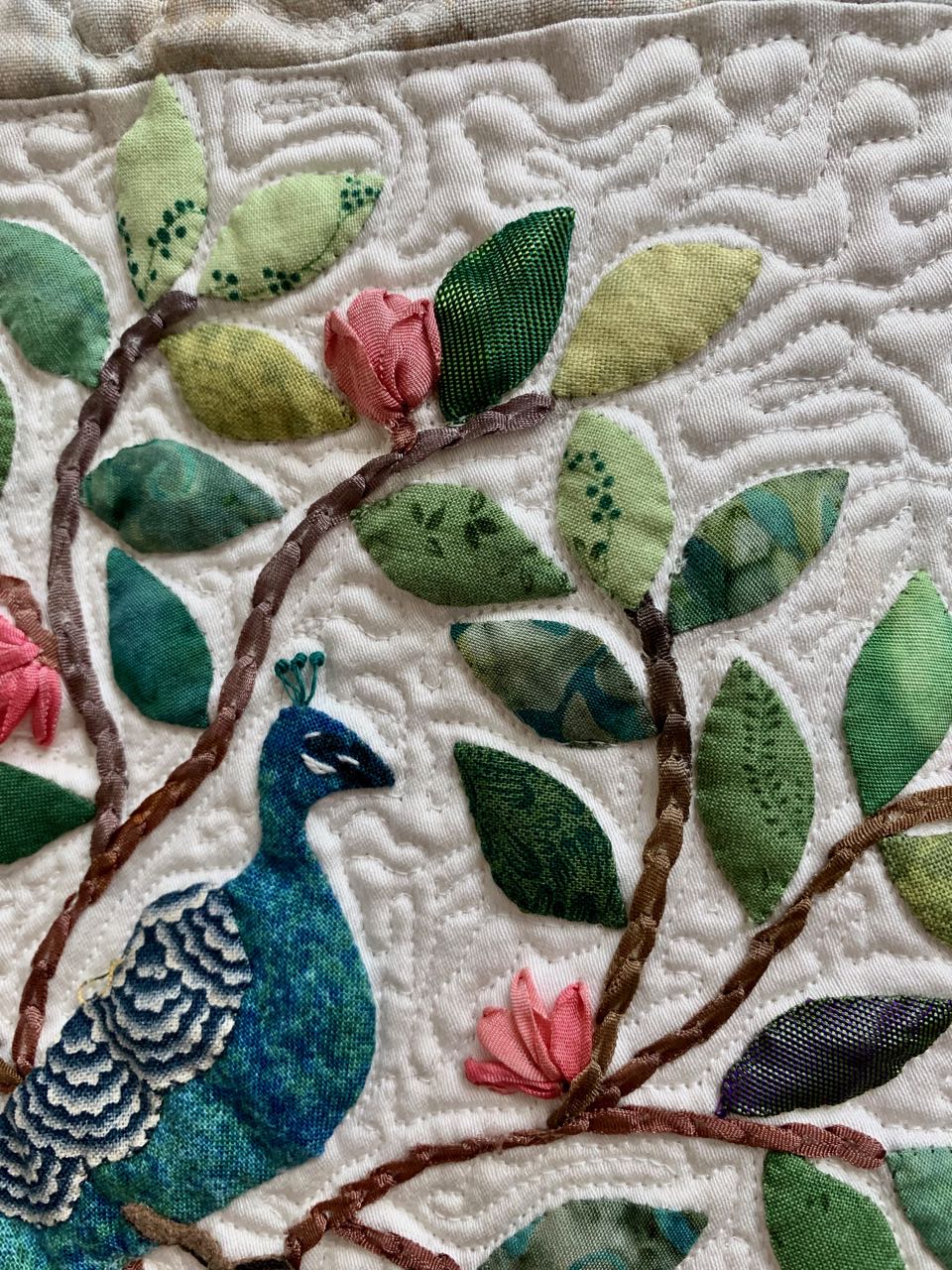 The Peacock’s is made with three fabrics; a print for the body and fussy cut fabric to create the folded wings and the tail is made of “eyes” individually appliqued. I struggled to get the “right look” for the eyes. One day on my way home from work, I drove by a farm and a peacock was on the fence. I slowed down to get a good look at his face – and he let me! I went home and finished the peacock using using ultrasuede and a black pigma pen and added his crown feathers.