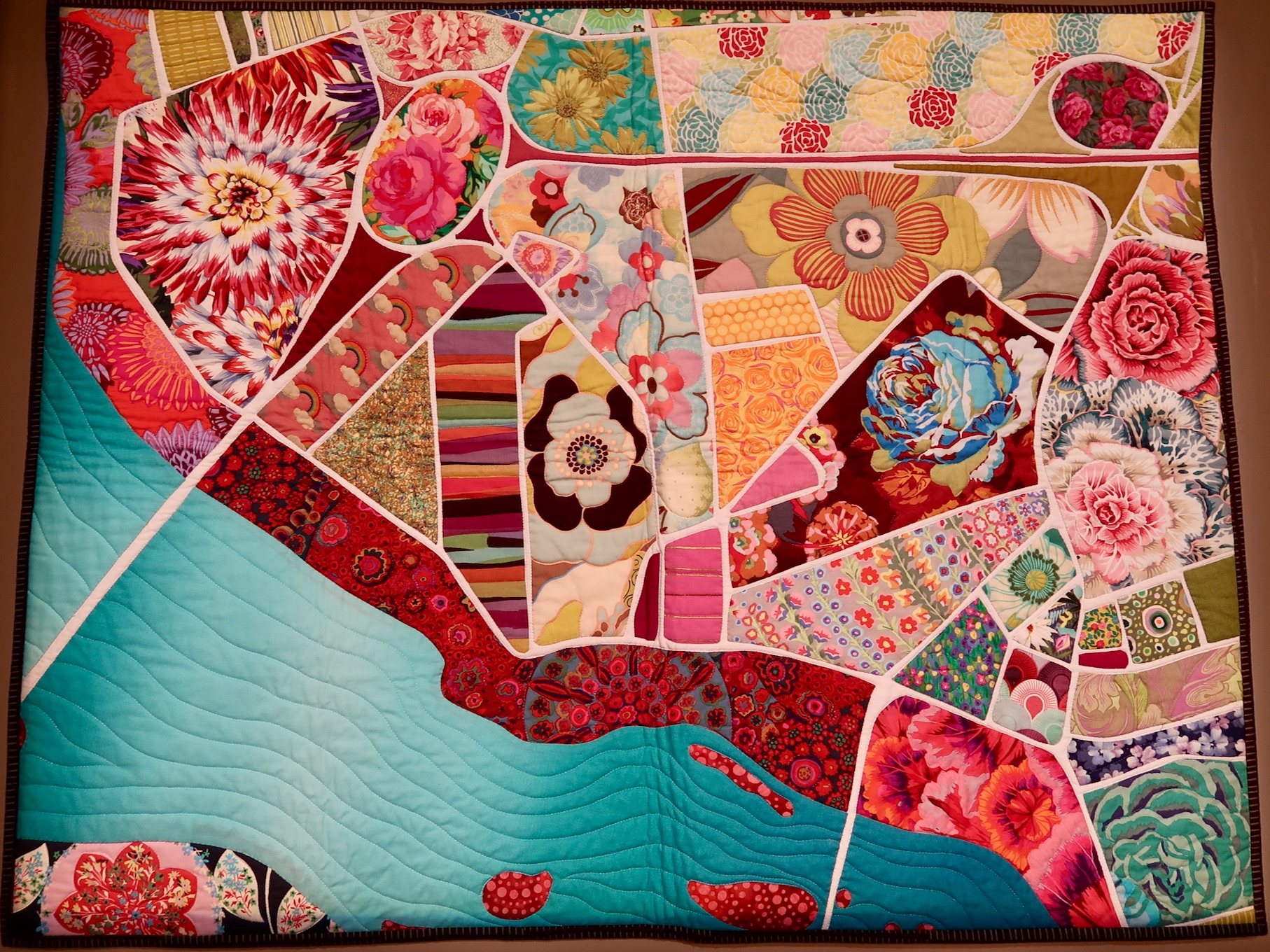 Roses in the Rotary is a quilt map of Timna's neighborhood. All of the flowers are the blocks of the neighborhood next to the Connecticut River.