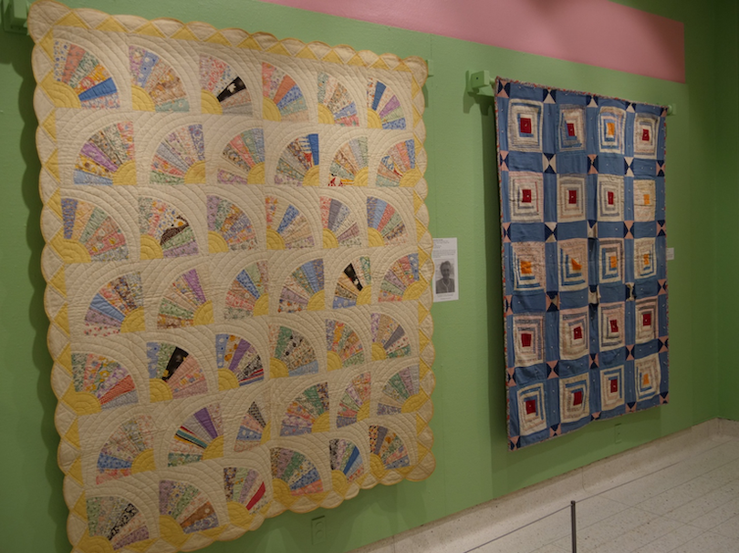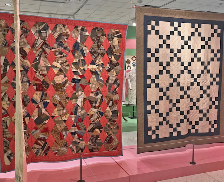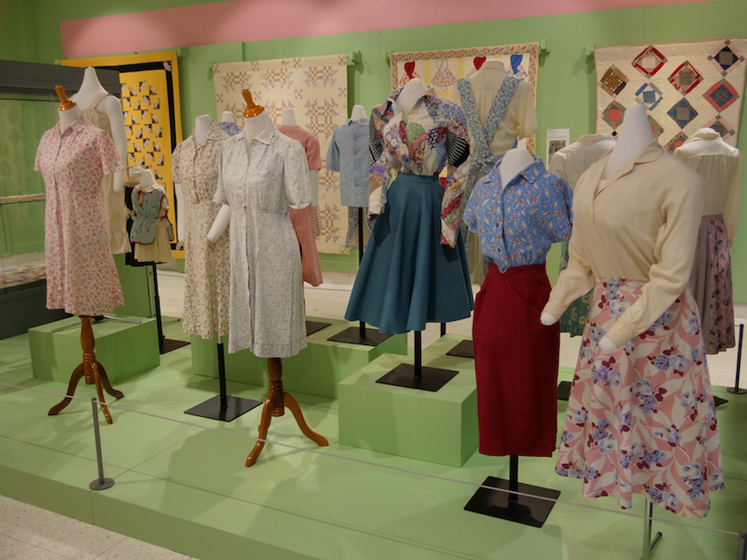 The carefully selected 1930s apple green gallery walls coordinate beautifully with the colors of the quilts and other items on display. The Museum’s collection includes over 3,000 examples of the various prints used for the sacks and as many as possible are part of this special exhibit.