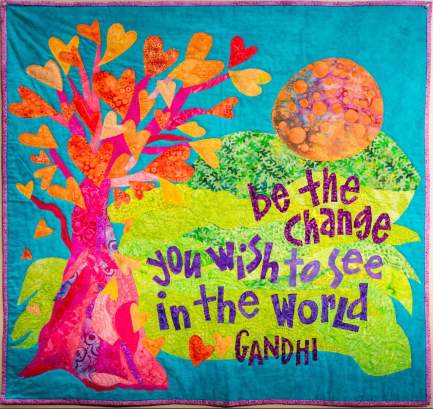 Vibrant colors and inspirational words from Ghandi are all part of this whimsical quilt, Be The Change, by Joanne Sharpe.