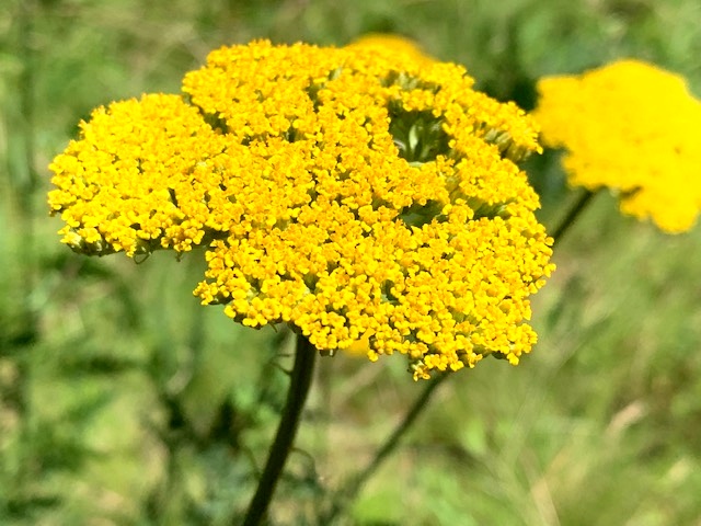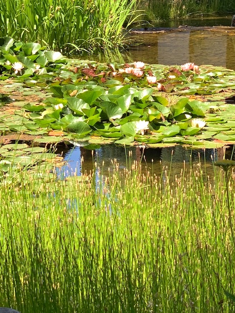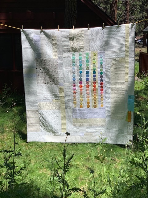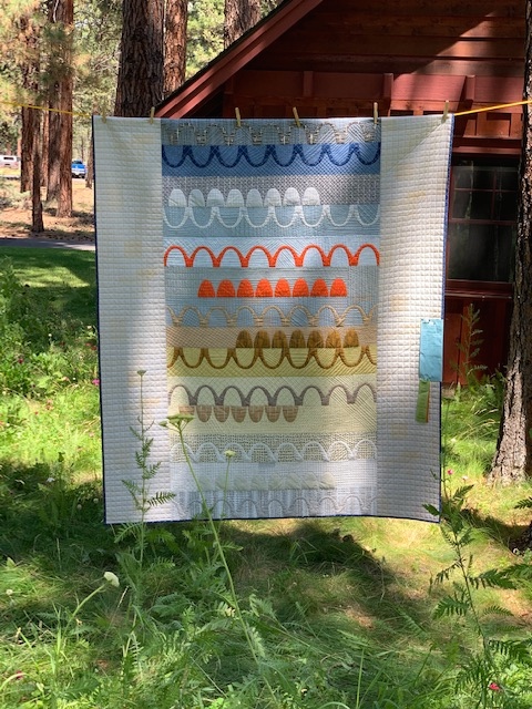 The guest speaker shares their process and history, which not only includes a lecture and slide show but also a walking tour with the artist through the grounds of 5 Pines. The quilts are hung between the trees with the beautiful wild flowers beneath and the sunlight dancing across them.