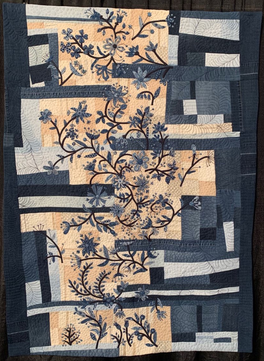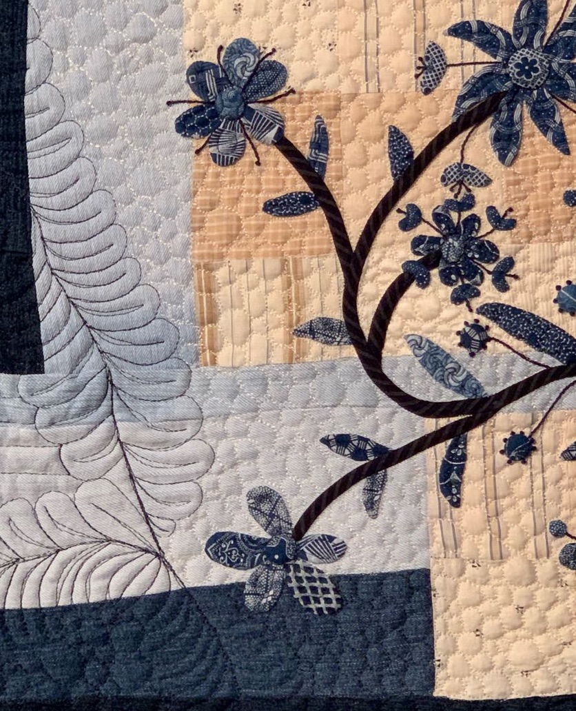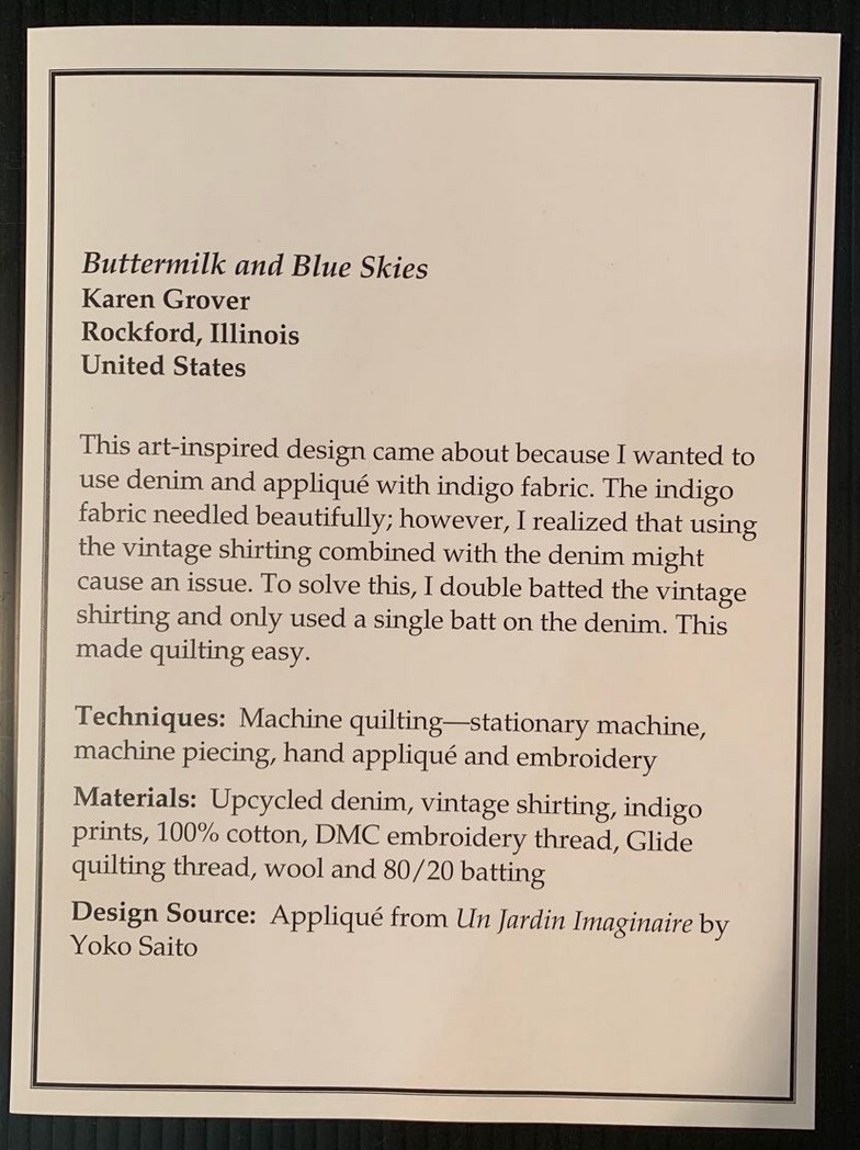 Karen Grover wanted to use denim, vintage shirting, and appliqué on indigo fabric. She discovered she might have a bit of an issue with the different weights of each fabric and came up with an elegant solution. She also created the very elegant Buttermilk and Blue Skies.