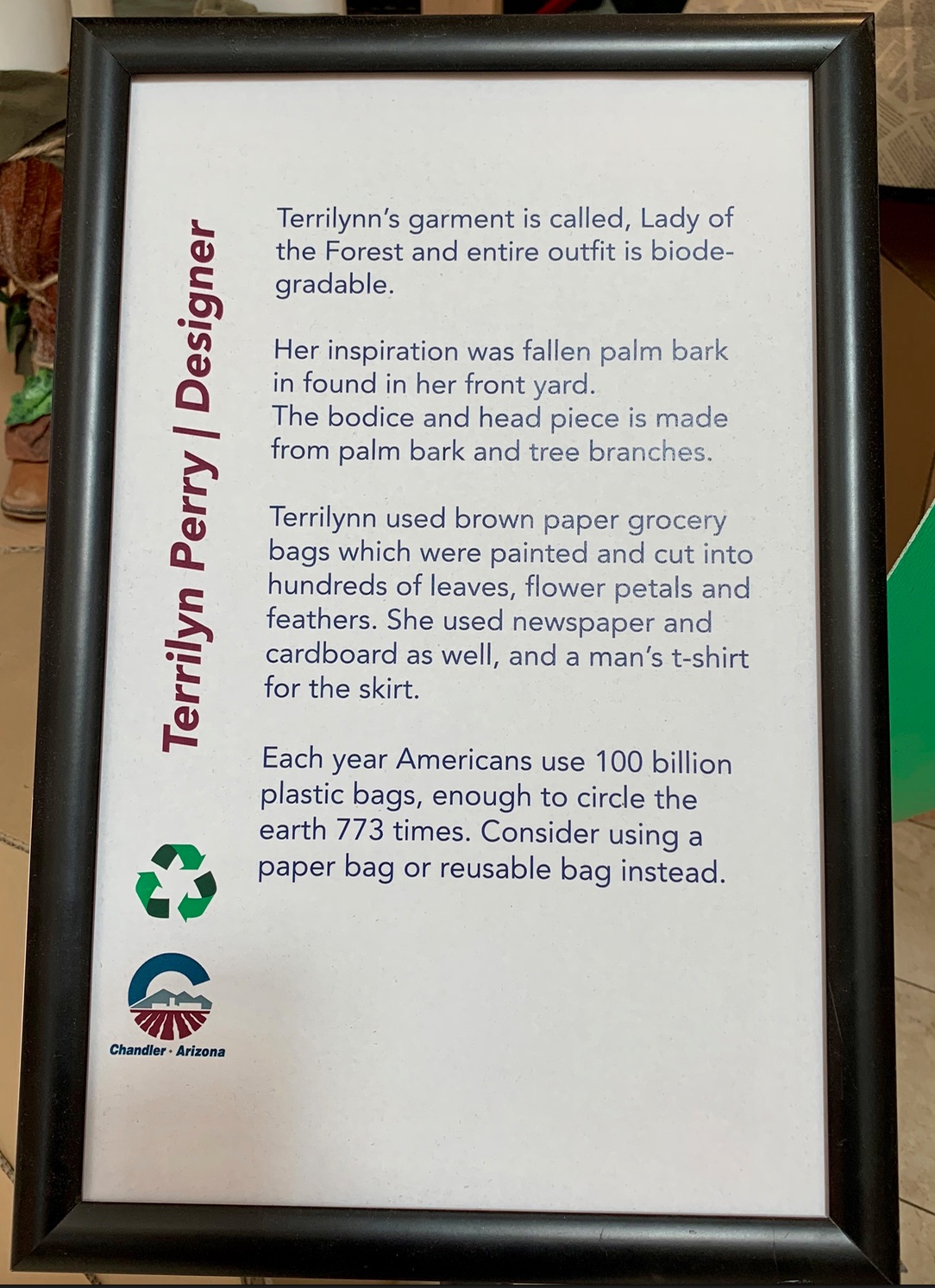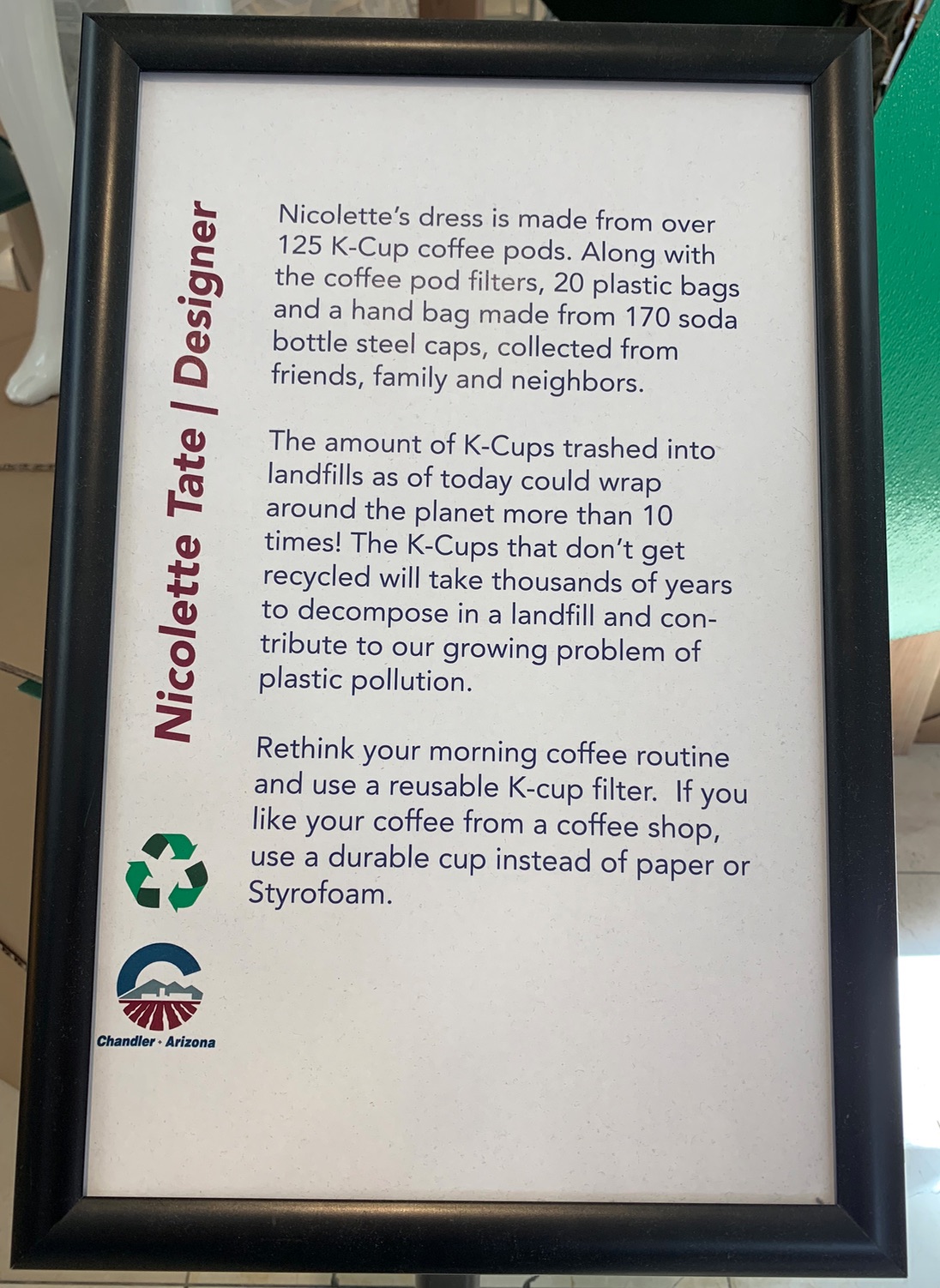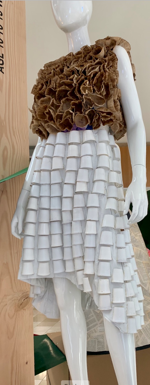 These designers did. We found this exhibit from the Chandler Trashion Fashion Show in a shopping mall in Chandler, AZ. The designers of these fashions range in age from 10 to adult and turned everything from coffee pods and newspapers, hula hoops and palm bark, into fashionable garments. Scroll down after the photos for a video about the fashion show.