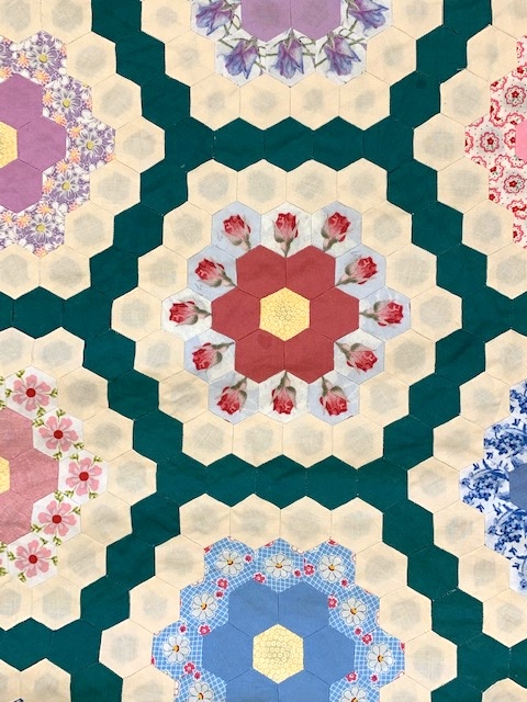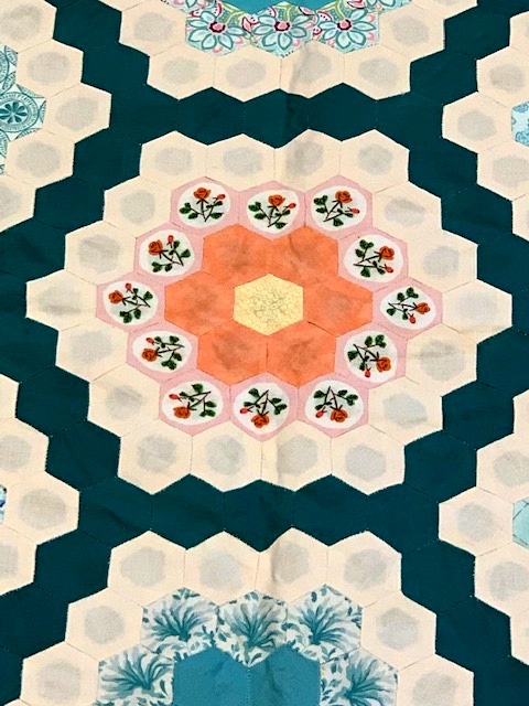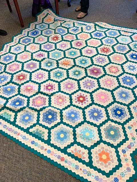 This year there was one participant who's quilt won the "Courage in Creativity" award. She was on a flight and sat next to a woman who was hand piecing hexies. Her curiosity sparked a conversation, and by the time the flight was over she was dreaming of her own hexie quilt. Yes, creativeness takes courage...but a courageous mind enjoys being challenged. And...oh was this quilt challenging...because it was her FIRST quilt ever!!! YES, I did say 1st quilt ever!