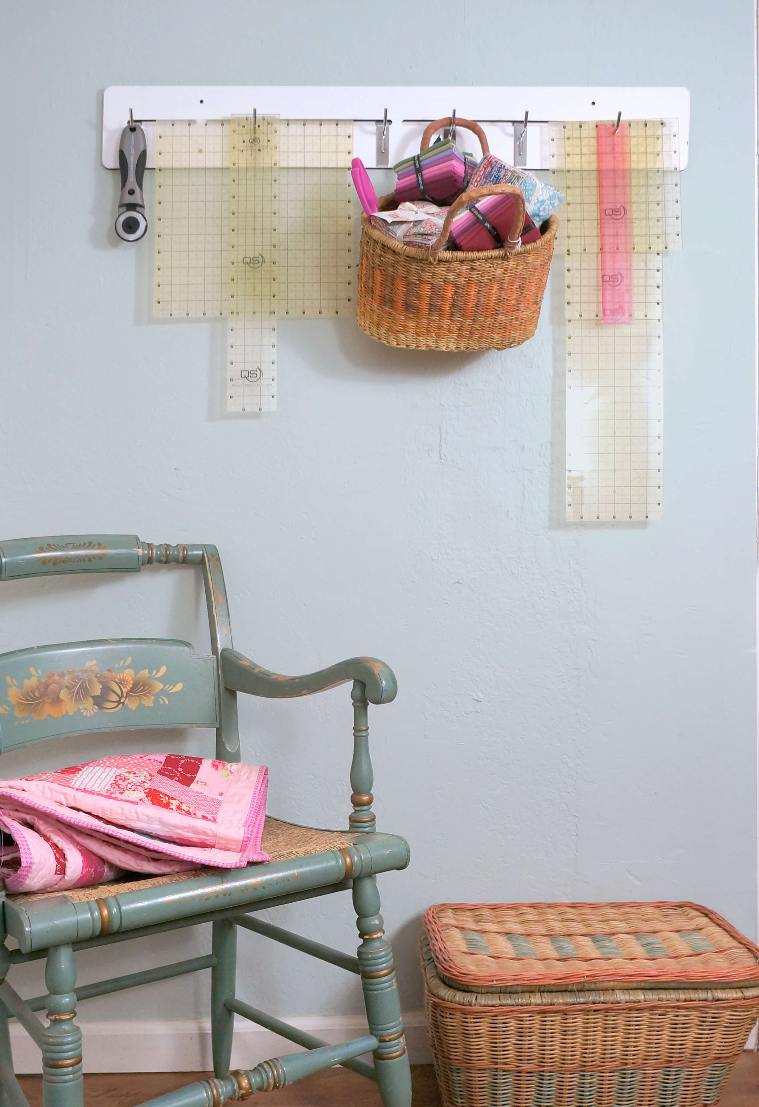 The rulers fit in the spaces between the wires and I can put several in each space in order of size, back to front. It keeps them handy and also so that I can easily pick the one I want and not have to sort through them.