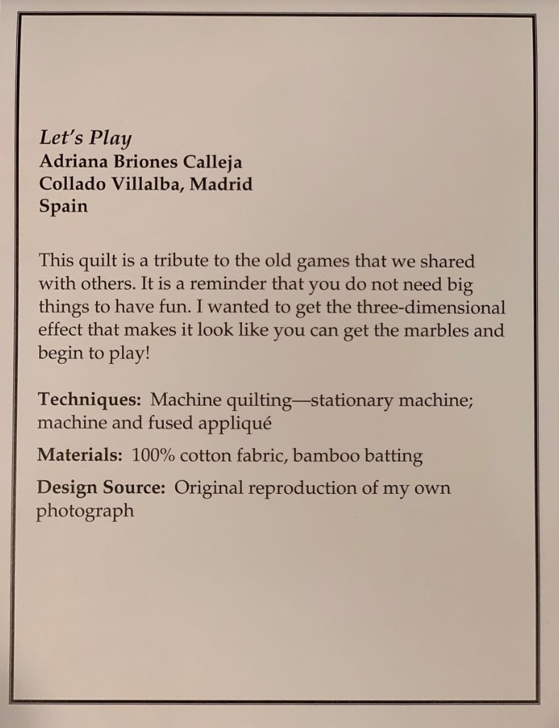 Let's Play was on display as part of the Pictorial exhibit at the Houston International Quilt Festival 2018.