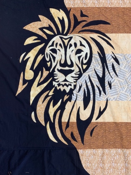 Already we have had some wonderful stops and made new friends. Fiber & Stitches is located in St. Helens, Oregon, AKA Halloween Town, and the owner Jamie is just like the rest of us as you can see by this quilt that she started for her son...maybe 6 years ago, LOL. But, now she is on the home stretch! What was a wall hanging has turned into a large bed quilt.