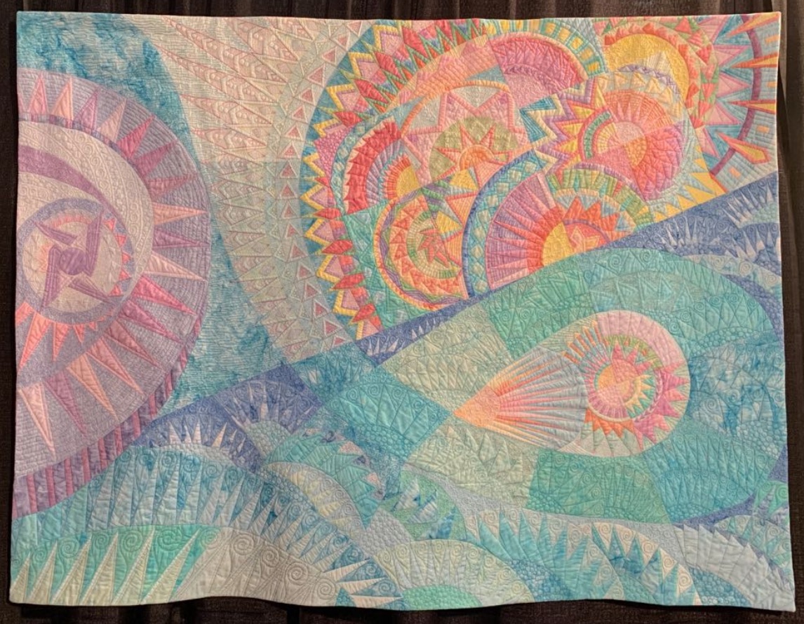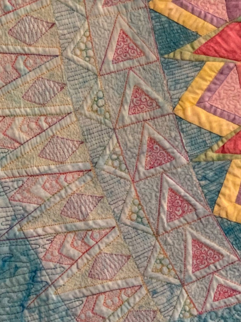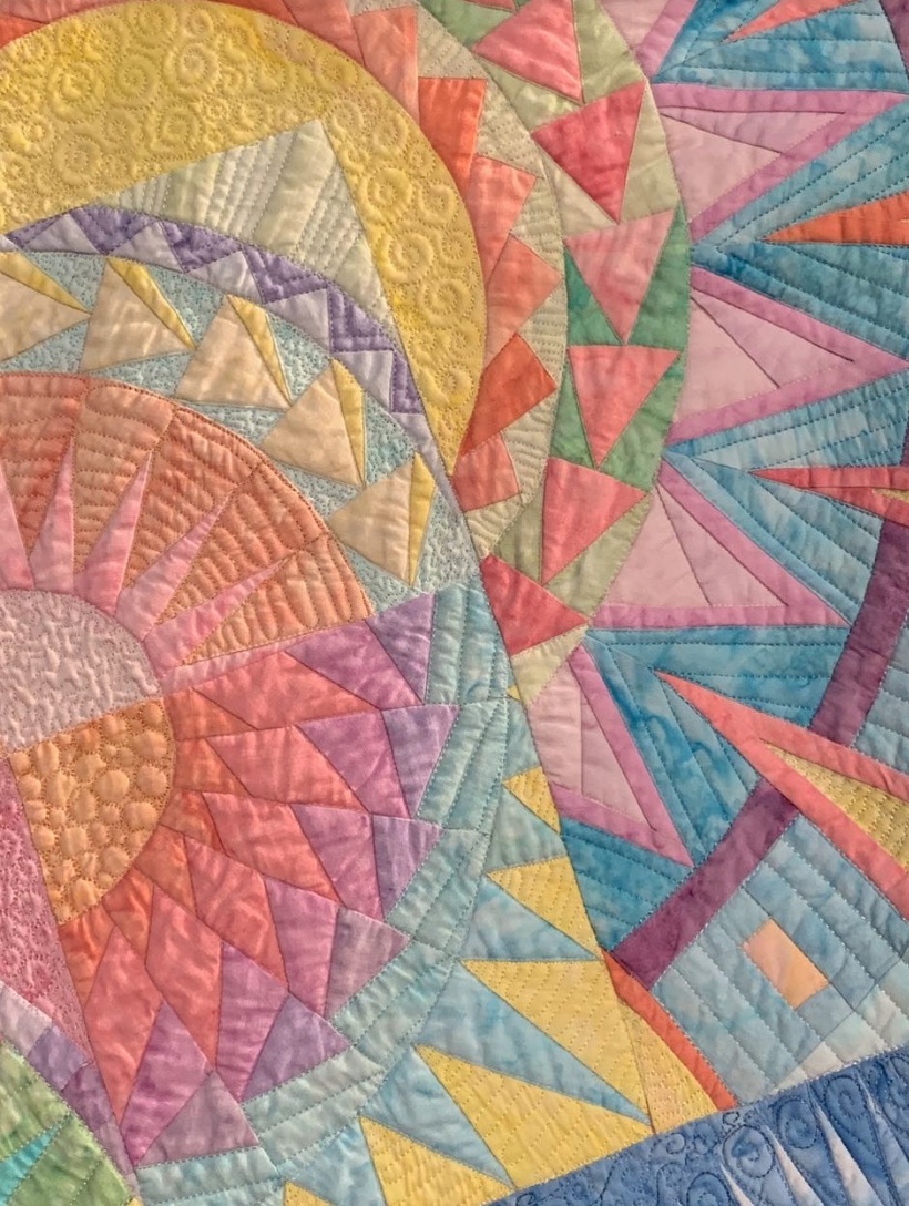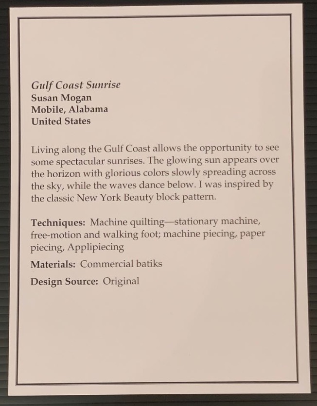 Gulf Coast Sunrise by Susan Mogan is a beautiful quilt inspired by the New York Beauty pattern. We were intrigued by how she replicated her piecing with her quilting and thread choices. We enjoyed looking at all the details in this spectacular sunrise.