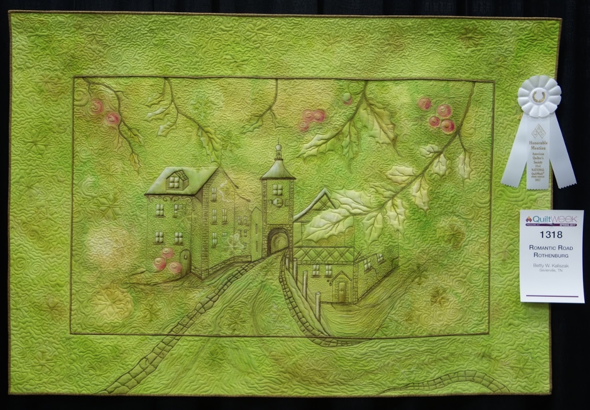 Tamara Hanes interviewed Betty Kaliszak about her quilt, ROMANTIC ROAD ROTHENBURG, at AQS QuiltWeek in Chattanooga 2016. Betty won 1st Place in the Wall Quilts – Pictorial category. Learn how she dyed and painted the fabric for her quilt, which started out as a piece of white cloth. What is her secret ingredient? Find out in the video below where she discusses how she made the quilt.