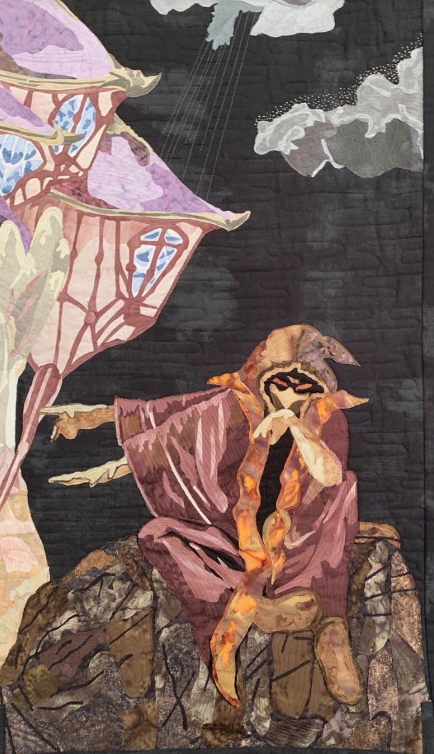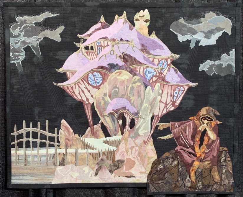 Esther Tronchoni Simo's quilt, Who on Earth Lives Here?, is based on a picture by the artist Roger Dean. Dean is known for his album covers, logos, typefaces and organic architectural designs. (If you own an album by the group Yes, you probably have some of his art.) She let her imagination run wild and created a mysterious world of her own. Can you figure out who lives here?
