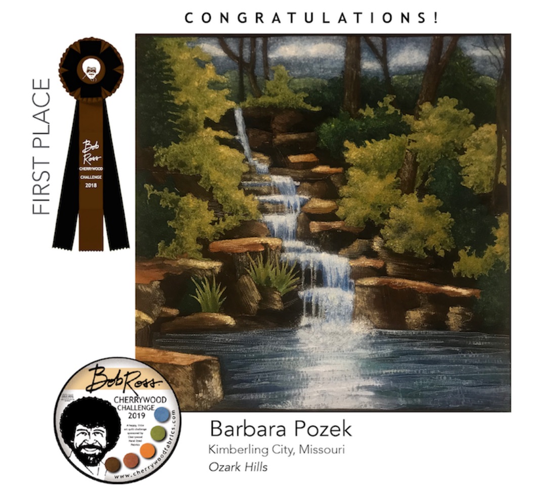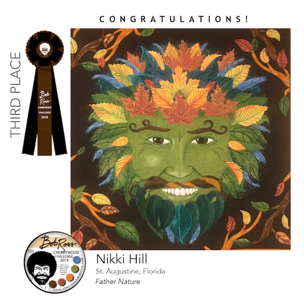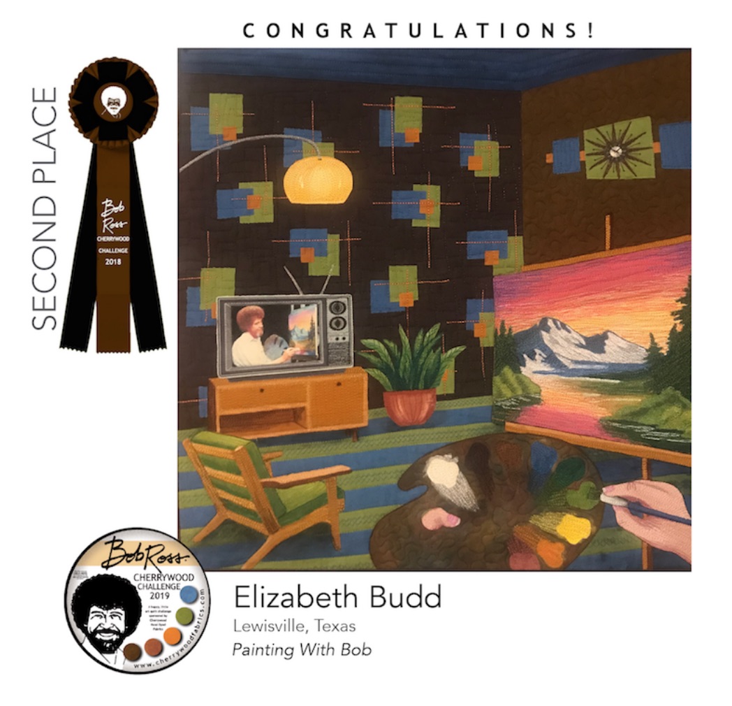 The previous Cherrywood challenges featured Wicked, The Lion King, Vincent Van Gogh and Prince. The challenge this year was to create a quilt using the artist Bob Ross as your inspiration. It had to measure 20" x 20" and you could only use the fabric provided in the challenge pack.