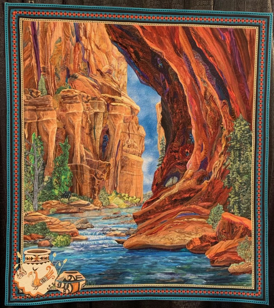 Kathy McNeil writes that hiking through red rock country takes her breath away. We'd have to say that this quilt takes our breath away as well. Masterful appliqué and little hidden treats in the fabric keep us interested as we search and explore all the hidden details in her design.
