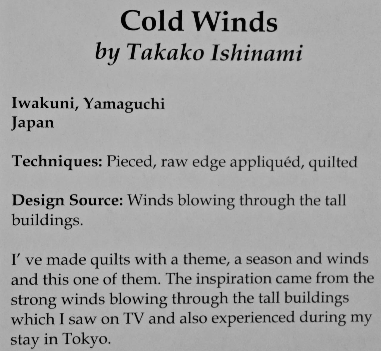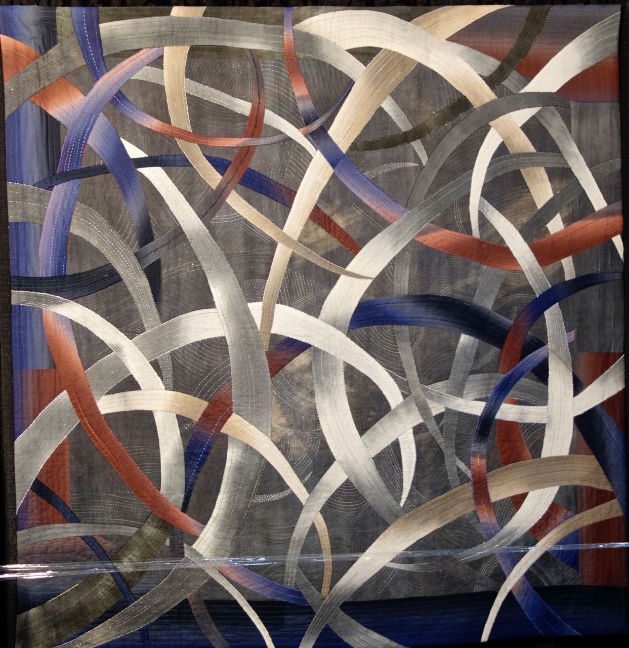 In looking back at pictures we ran across this wonderful Japanese quilt. It was an award-winning quilt we saw at Houston in 2012 and came from the exhibit "Winning Quilts - International Quilt Week Yokahama 2011". It has a very modern feel and the fabric movement really gives you a feel of the winds. But don't miss the big stitching that is done in a way to add to the movement and feel. Don't you love the use of color?