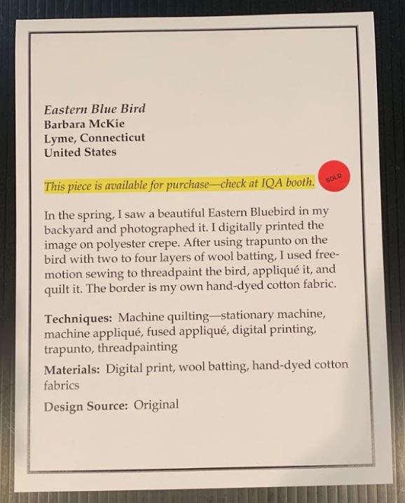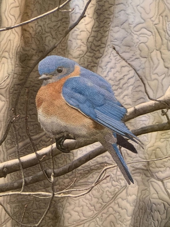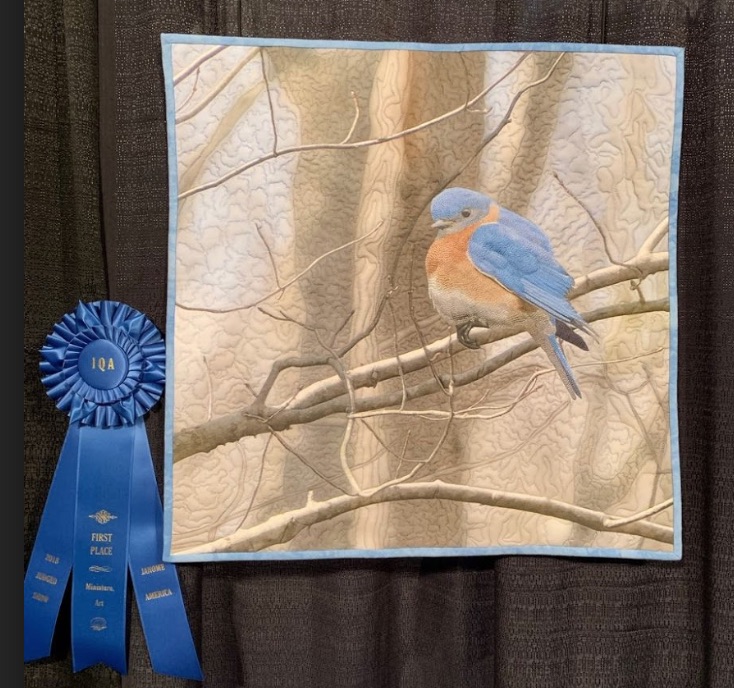Eastern Blue Bird won 1st Place - Miniature Art at the Houston International Quilt Festival 2018.