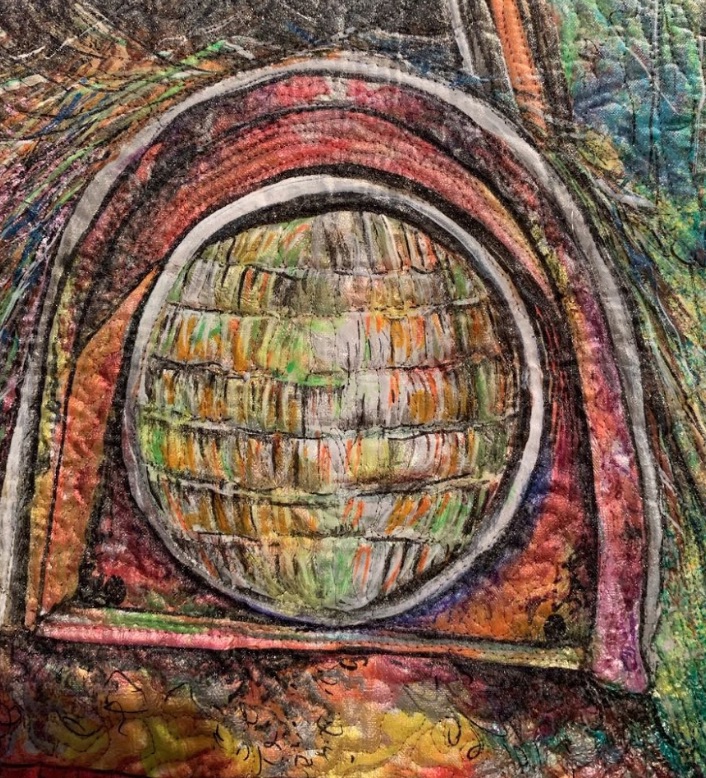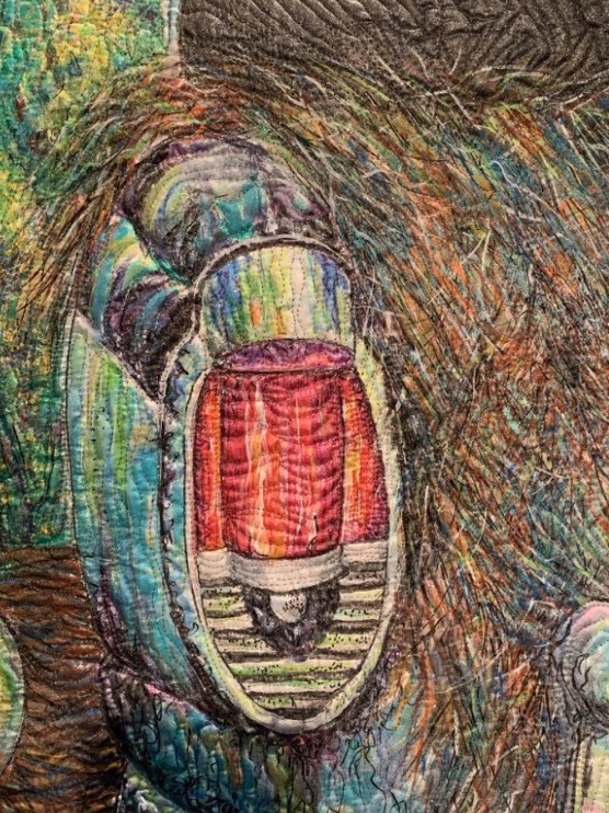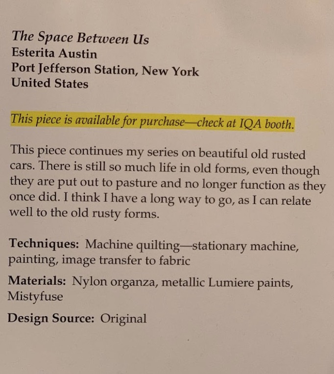 In her quilt, The Space Between Us, a continuation of her series on old rusted cars, Esterita Austin feels there is still life left in the machines which have been put out to pasture. She says she can, "Relate well to the rusty old forms".