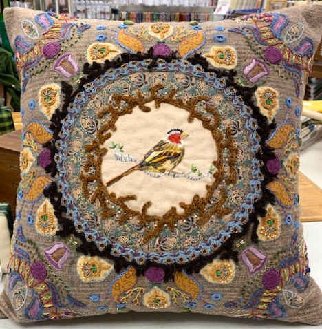 Well, last Sunday I was talking a class at Acorns & Threads a cross stitch shop in Portland. It was a general educational class on cross stitch. You are wondering what this has to do with quilting? Sitting next to me was a classmate named JoJo and as we talked it, turned out she and her husband had watched us on Quilt Roadies because she is a quilter also. It is always so fun to meet those who follow along with us on our journey in life. Next, she brings out a pillow she recently finished and it is gorgeous!