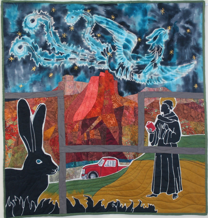 Ellie Kreneck’s quilts have since been featured in SAQA exhibits at the Houston International Quilt Festival and also SAQA traveling exhibits. With her strong ties to Lubbock and Texas Tech University, Ellie’s donation of two of two works was especially desired for the Museum’s collection. Her quilts reflect a love of the West Texas landscape in their coloring, but also her wit and strong Catholic faith, something she shared with Yvonne.