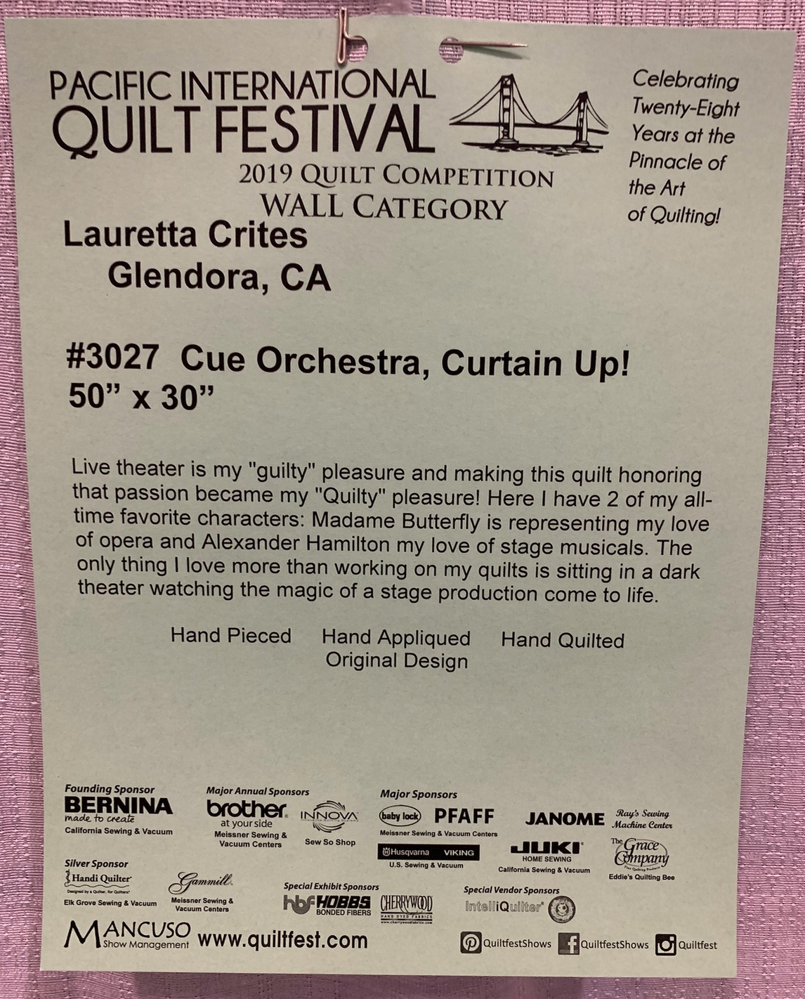 We found this quilt at the Pacific International Quilt Festival 2019 and we knew right away that Ricky would love it! It features Hamilton from the Broadway musical of the same name. If you watch Show 2106 with Meg Cox or Show 2108 with Deb Boschert, you'll learn more about his love for the show.