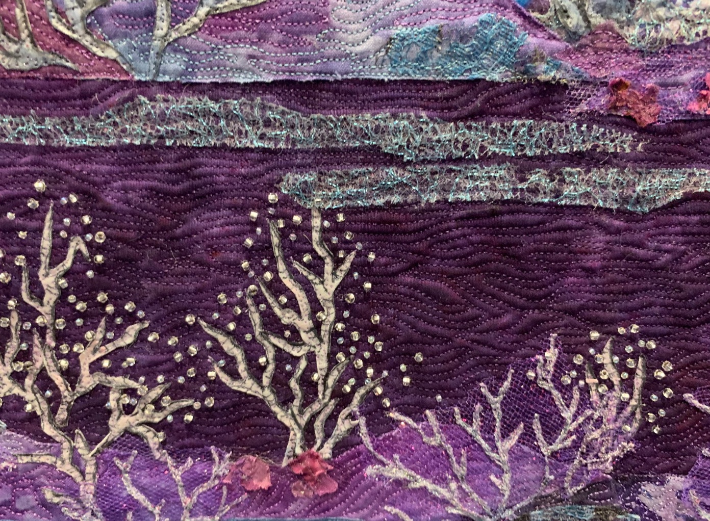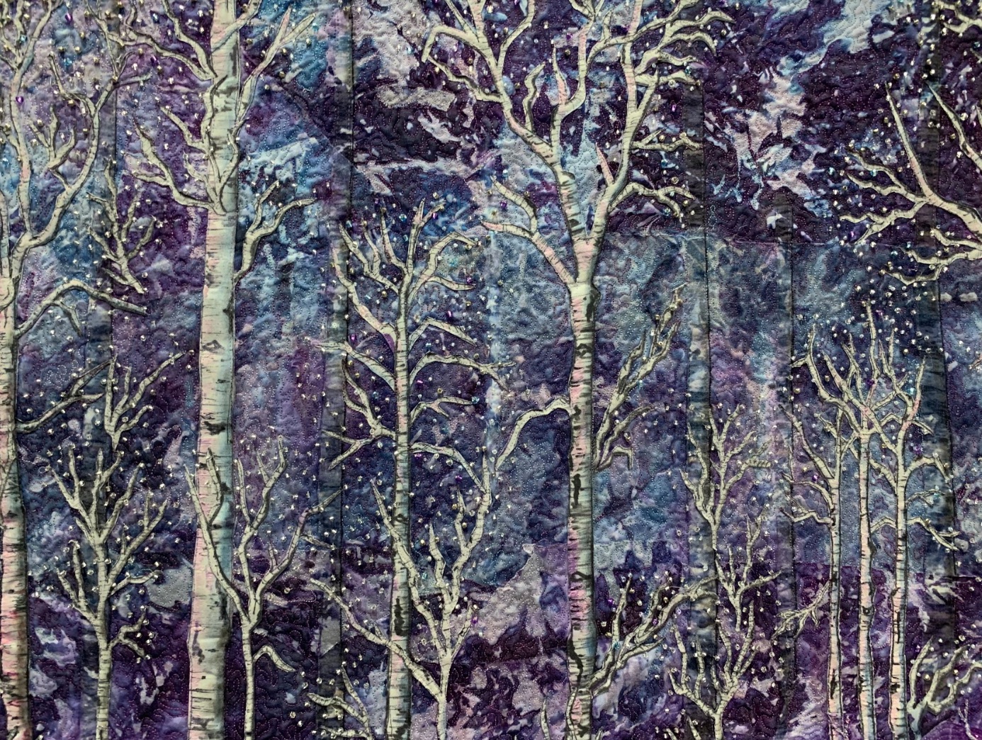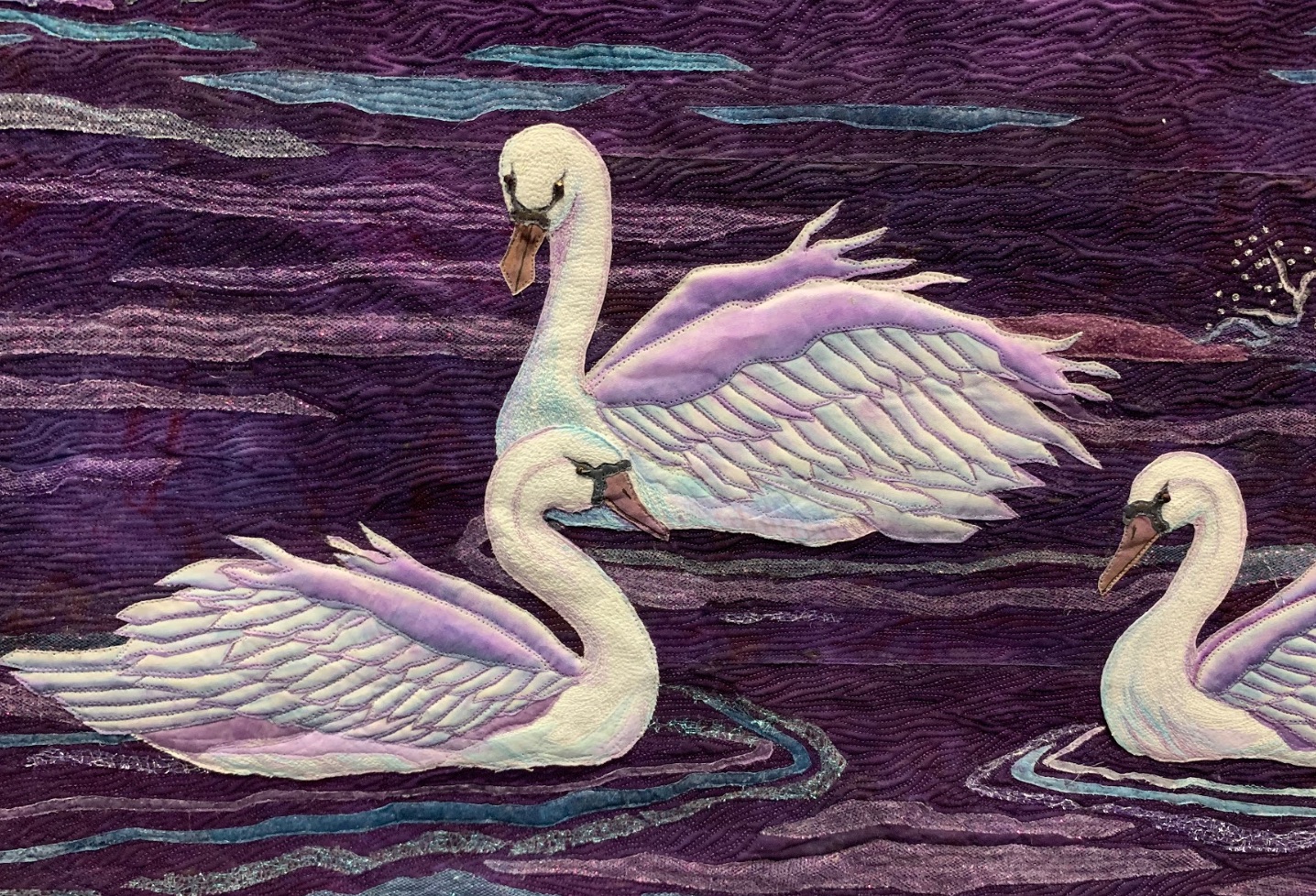 This beautiful quilt of swans swimming on a lake of lilac by Joanne Baeth is an award-winner in our book as well. Feathers and Frost was created with 4 overlapped layers of background. Thousands of beads cover the trees and each feather on each bird was constructed one at a time.