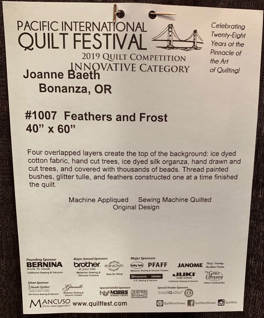 BERNINA 1st Runner Up Best Sewing Machine Workmanship Award - Pacific International Quilt Festival - PIQF 2019 - Joanne Baeth