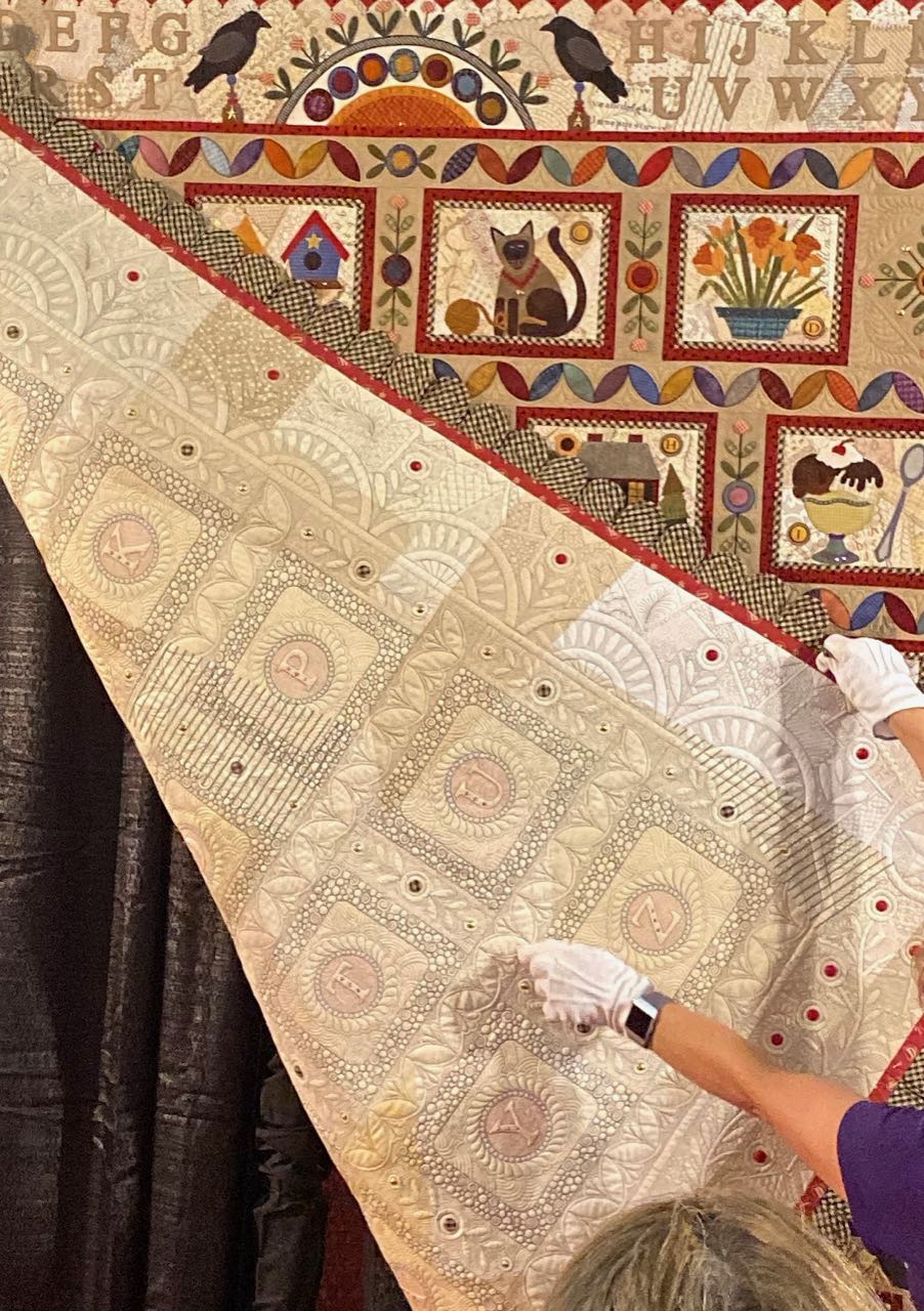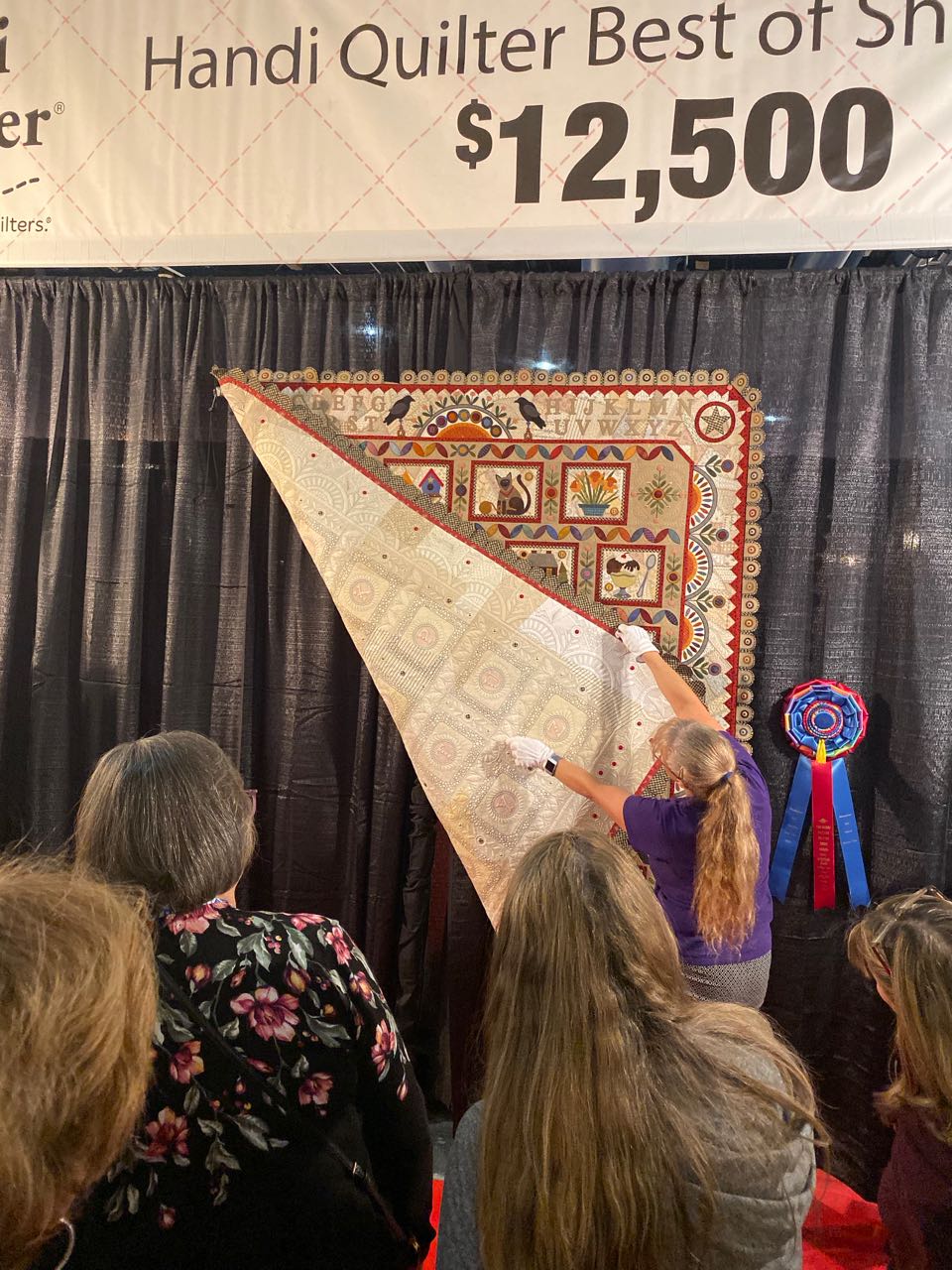 As promised, we got the white glove lady to show us a peek at the back of Janet Stone's Best of Show Quilt Crazy Four Ewe. Look at how the letters are totally different from the front of the quilt. Amazing!