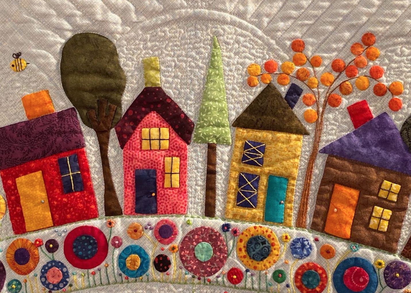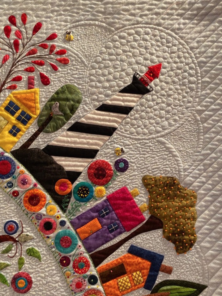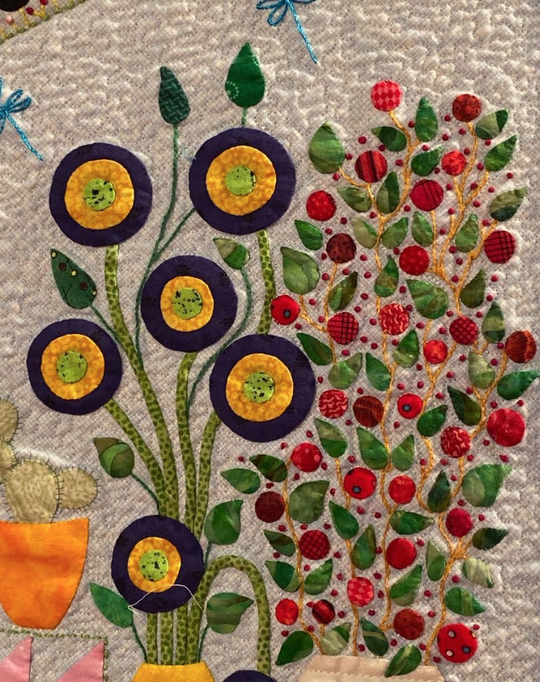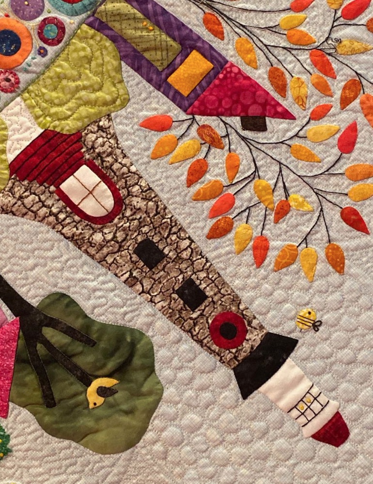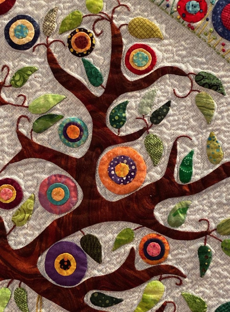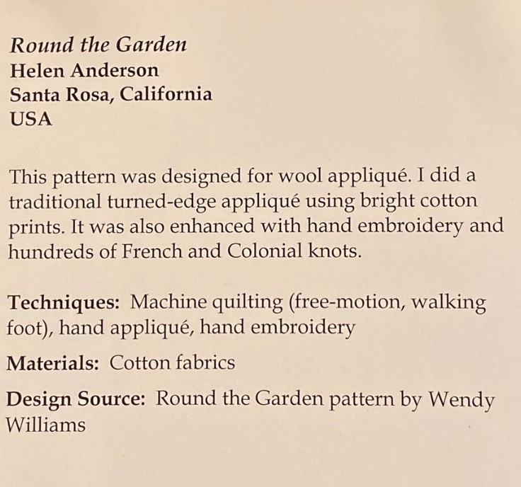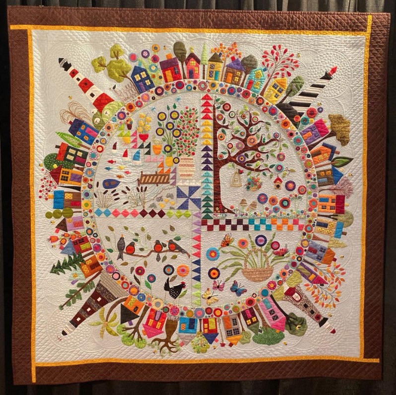 Helen took a wool appliqué pattern and recreated it using needle turn appliqué to create her quilt, Round the Garden. That's a lot of edges to turn under. She further enhanced the design with embroidery and hundreds of French and Colonial knots. This is not your 'quilt-in-a-day' quilt. Did we mention that it was part of the SMALL appliqué category at the International Quilt Festival in Houston 2019?