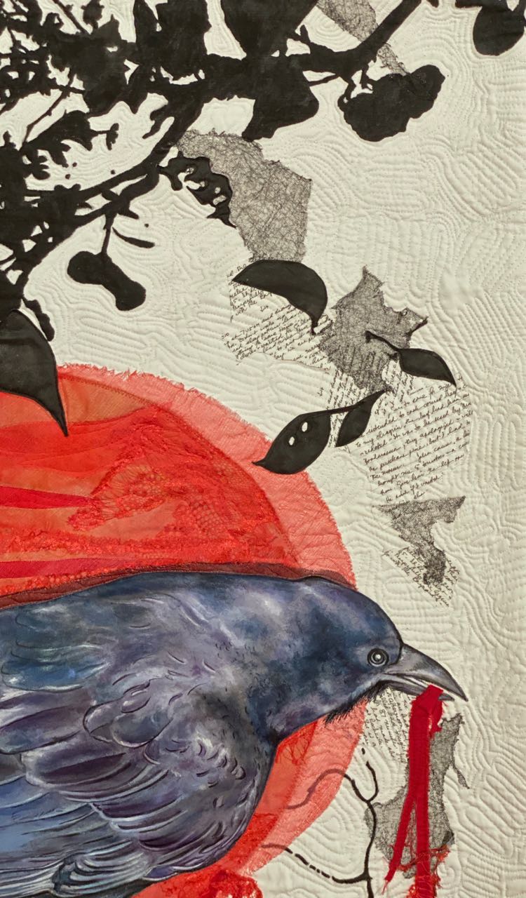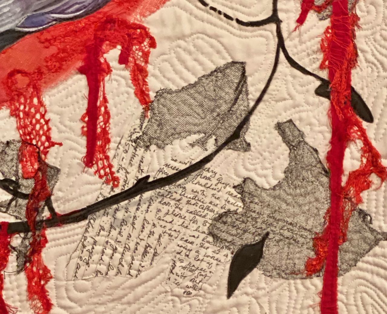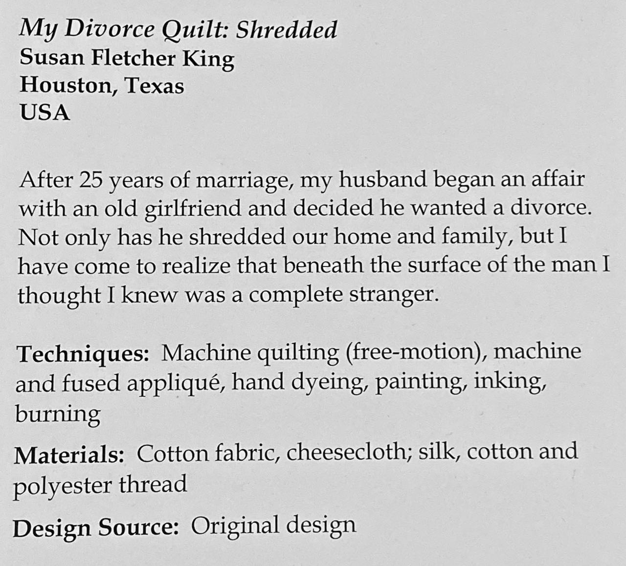 Quilting has always taken on hard subjects. My Divorce Quilt: Shredded, a quilt by Susan Fletcher King, expresses her reactions to a difficult life event. The quilt achieves strong emtions by using raw edge appliqué to effect, strong black and red images, and appears to have journal entries or letters placed throughout the quilt.