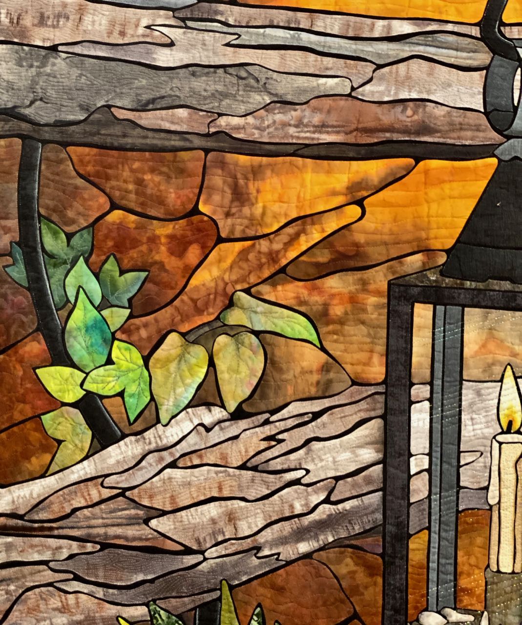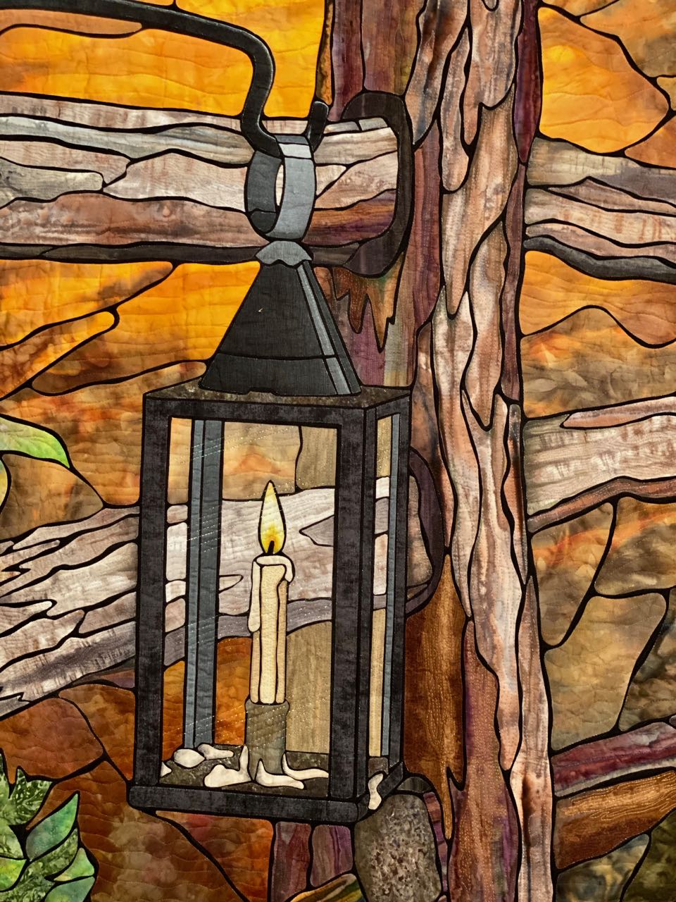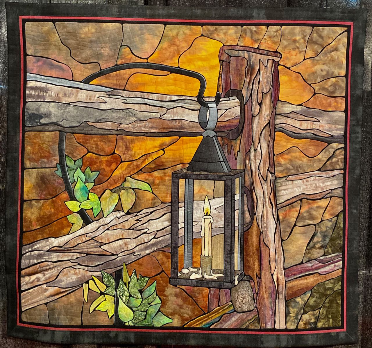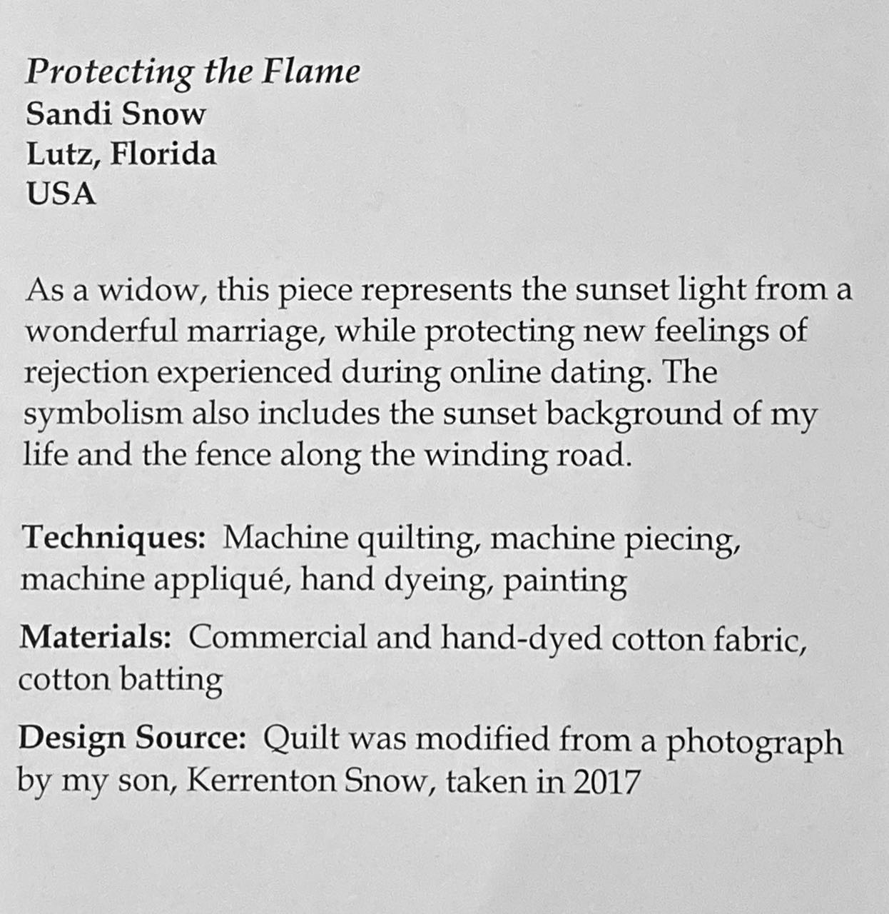 Another passage in life is adjusting to losing a life partner. Sandi Snow won an Honorable Mention Ribbon at the Houston Quilt Show 2019 with her quilt, Protecting the Flame. Her use of color, gradation and texture is beautifully done.