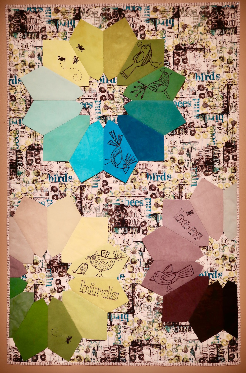 Hand-dyed fabrics, embroidery, and Dresdens make up this adorable quilt made by Lauren Vlcek for Susan Cleveland's book. We just love the little embroidered birds. Enjoy The Birds and The Bees by Lauren Vlcek.