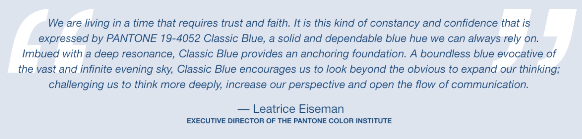 Imprinted in our psyches as a restful color, PANTONE 19-4052 Classic Blue brings a sense of peace and tranquility to the human spirit, offering refuge. Aiding concentration and bringing laser like clarity, PANTONE 19-4052 Classic Blue re-centers our thoughts. A reflective blue tone, Classic Blue fosters resilience.
