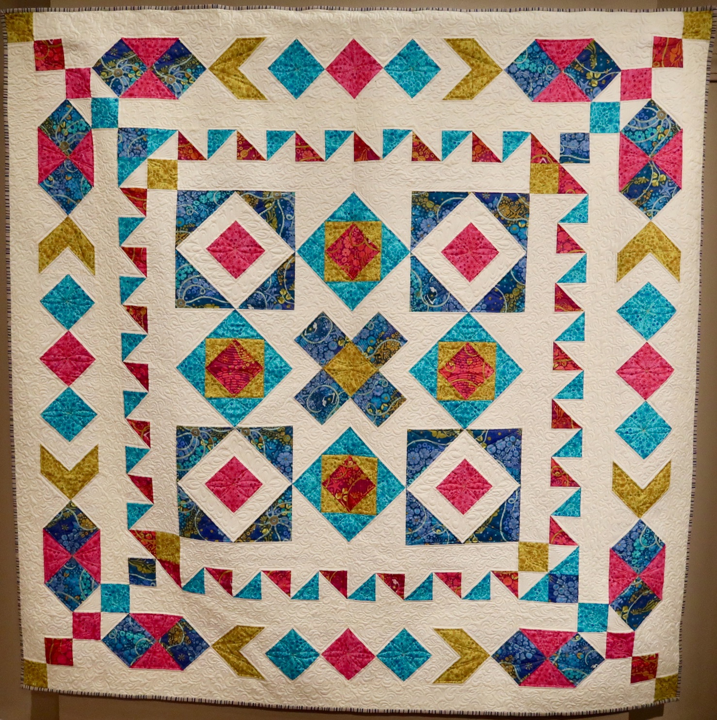 Pastures New is one of Sheila's typical mystery quilts. Easy piecing makes it accessible to everyone.