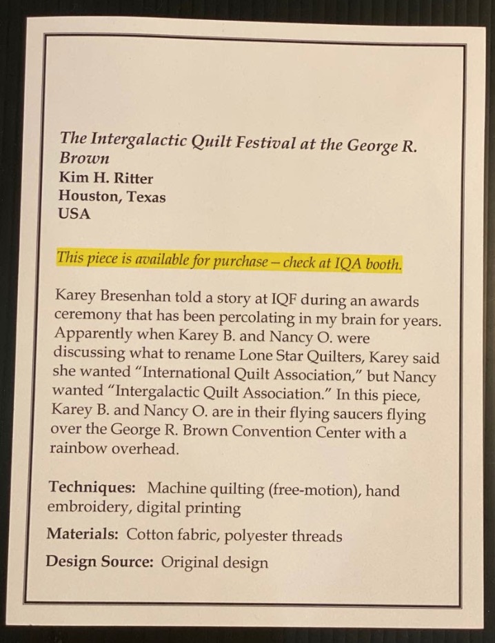We think Kim's sign says it all about her quilt, The Intergalactic Quilt Festival at the George R. Brown.