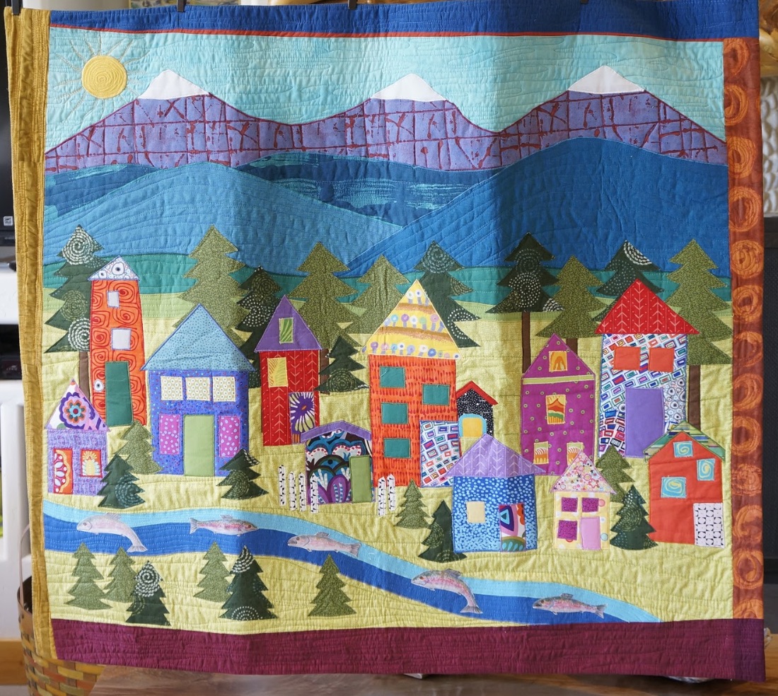 The Three Sisters Mountains preside over the town of Sisters, Oregon in Jean Wells' quilt, Creekside in Sisters. Wouldn't you love to spend time in this wonderful quilting community?