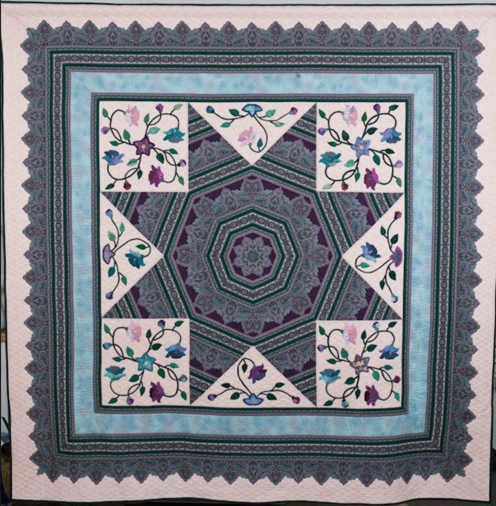 Barbara used a striped fabric to create the large center star for Lone Star Garden. The appliqué designs were adapted from Pat Campbell's Jacobean Appliqué designs. The outer border is soft-edge pieced with a Jinny Beyer border stripe fabric. Barbara bought 15 yards of the border stripe over several trips to the store to be sure she had enough.