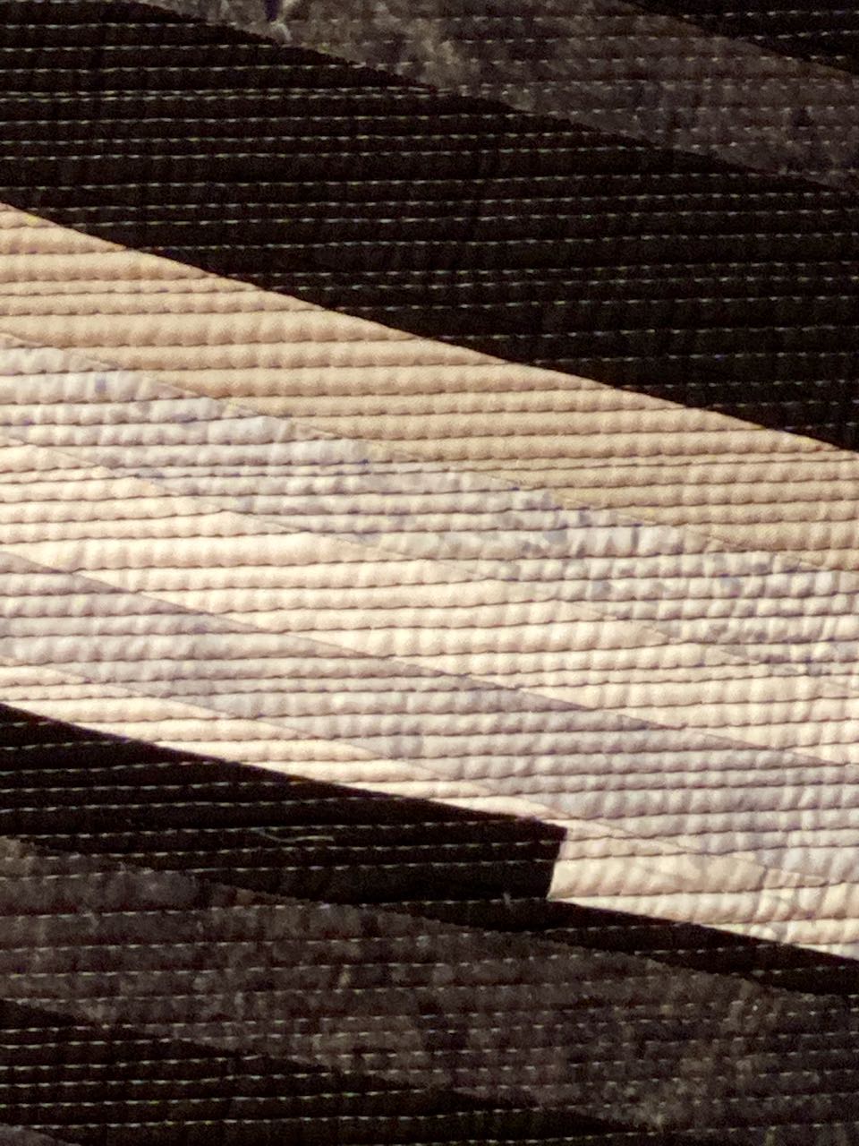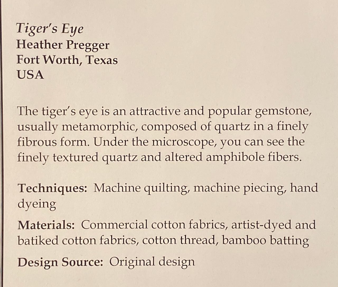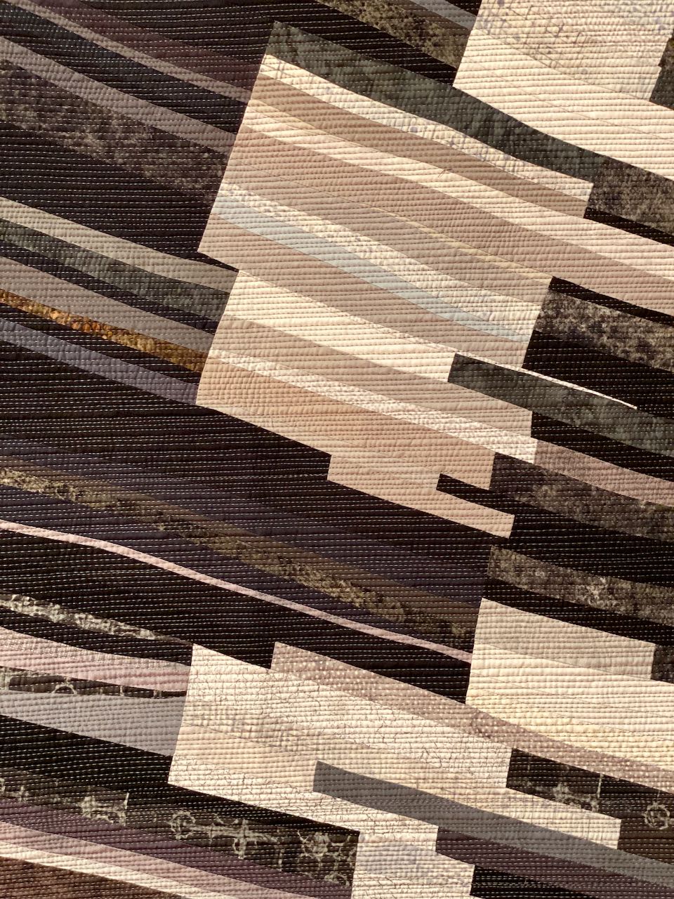 Heather Pregger won First Place, Abstract, Large at the Houston International Quilt Festival 2019 with her abstract version of a tiger's eye gemstone. In Tiger's Eye (50" x 72.5") she used strips of fabric to take her design to the "microscopic" level.