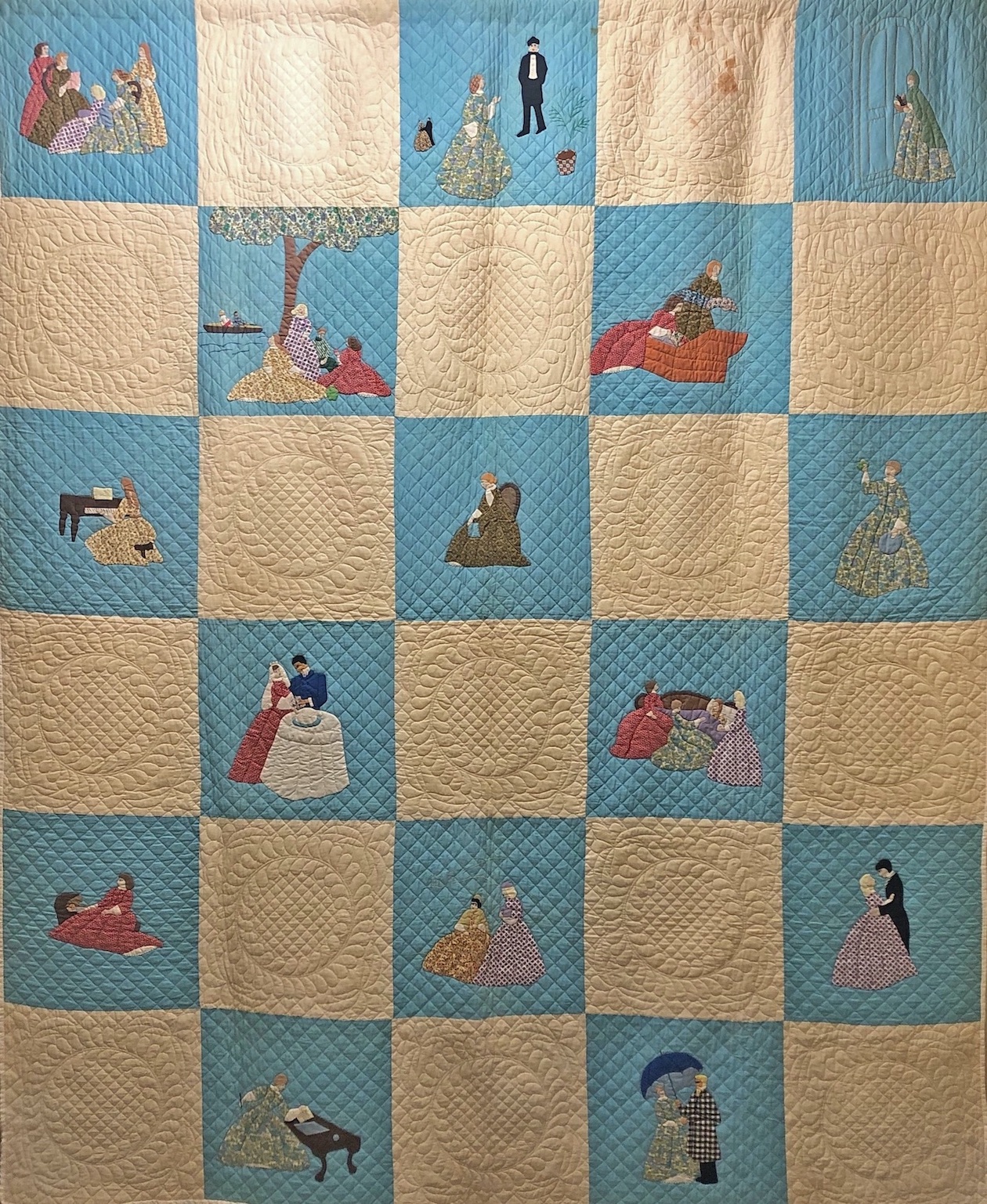 The Little Women Applique quilt pattern depicts scenes from the novel by Louisa May Alcott. The detailed images from the first three rows are(left to right) Father’s Letter from the War, The Christmas Party at Laurie’s House and Jo Brings Kittens to Laurie’s House; Second row (left to right) Meg Preparing to go on A Fashionable Visit, Laurie’s Picnic; Third Row (left to right) Beth Plays for Mr. Laurence, Marmee Receives a Telegram—Papa is Ill in a War Hospital, Jo has sold her hair to help Marmee visit Papa in War Hospital.