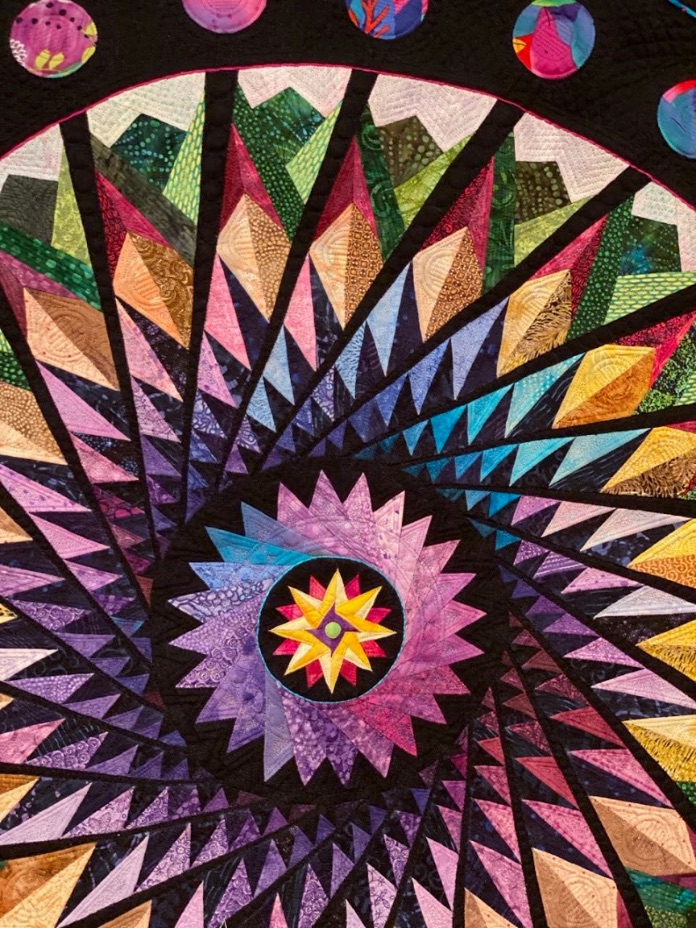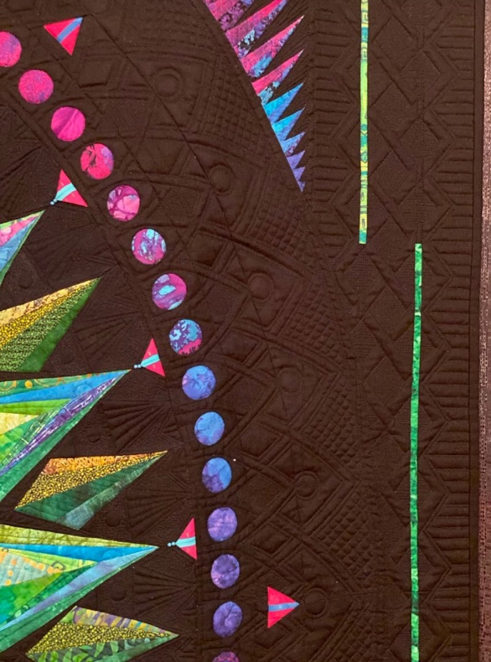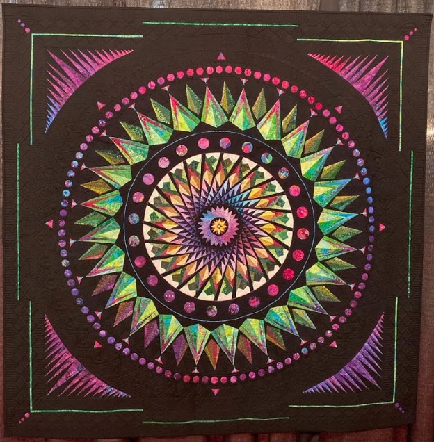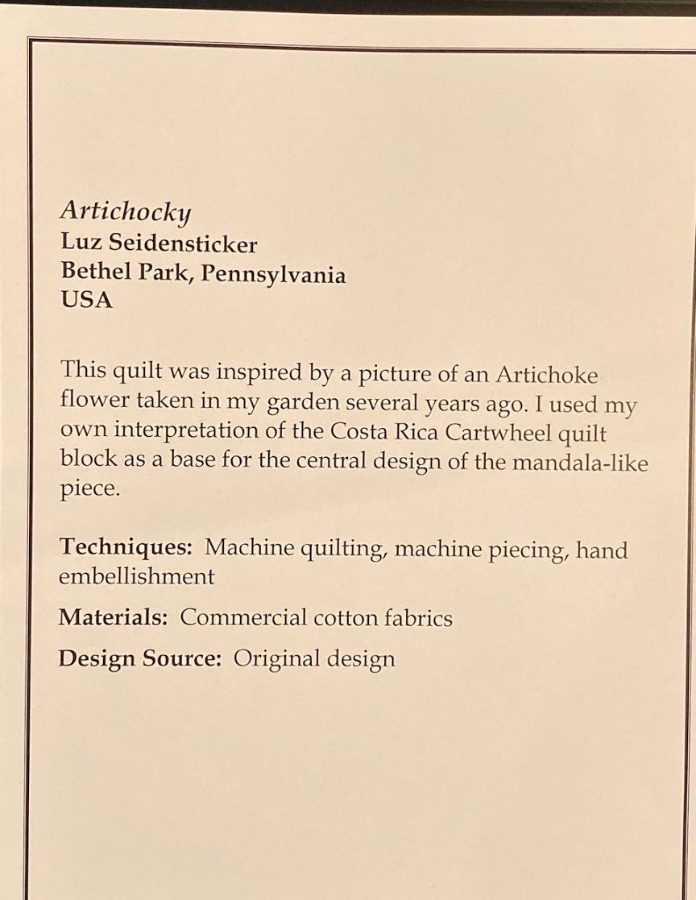 Luz Seidensticker's quilt, Artichocky, was inspired by a photograph of an artichoke flower taken in her garden. The mandala design was based on her own interpretation of the Costa Rica Cartwheel quilt. The piecing is impeccable. Take a look.