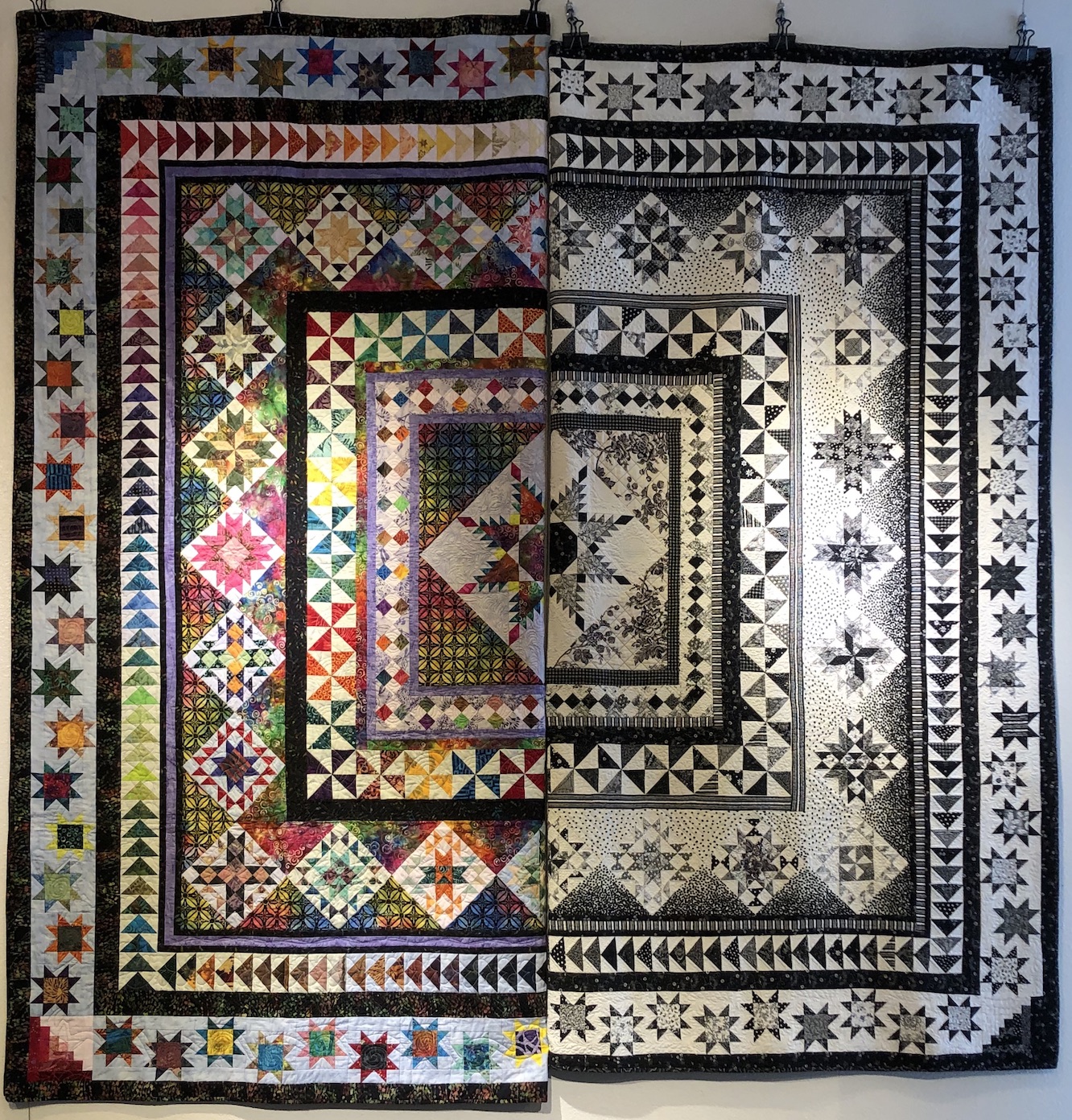 Two different quilters, Cheryl Garrison and Geneva Carroll, stitched up the 2009 TQS BOM Stars for a New Day (designed by Sue Garman) in two totally different color ways. The quilts were made by the women before they knew each other and now they have become great friends. One quilt is made in black and white and the other "June Cleaver on Acid". Bound together by their love of quliting...two different quilters, two great quilts.