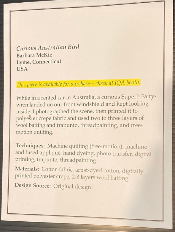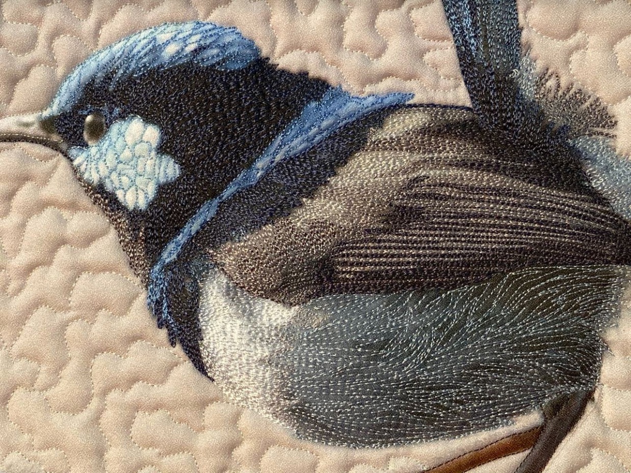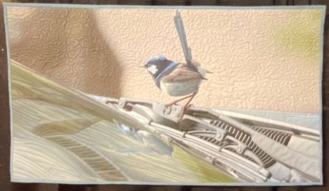 A Curious Australian Bird landed on Barbara McKie's windshield while visiting the countryside. Barbara took a photo and then printed that on fabric and threadpainted this lively little fellow with the beautiful blue crest.