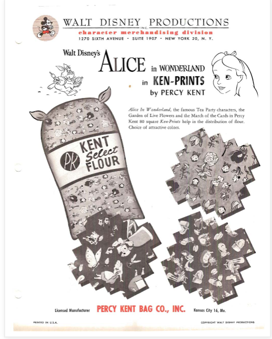 When Alice in Wonderland opened on July 28, 1951, Disney entered into an agreement with the Percy Kent Company to place their images on feed sack bags. The Percy Kent Bag Company was the first firm to put prints onto feed sack fabrics in 1937. To edge out the competition, increase consumer demand and improve sales, the company hired the well-known New York fabric designer A. Charles Barton to be the company’s design director.