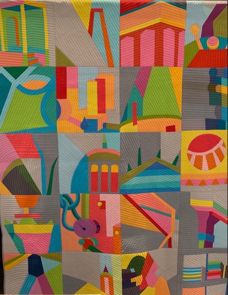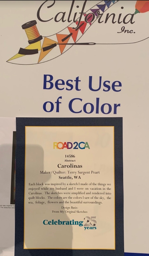 Carolinas by Terry Sargent Peart won the Best Use of Color award at Road to California 2020. Each block was inspired by sketches she made while vacationing with her husband. She simplified the sketches and made blocks representing the sun, sea, and sky which resulted in a very colorful quilt.