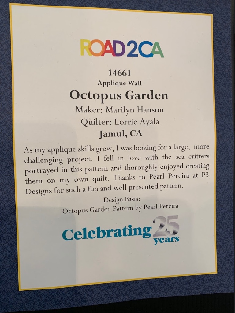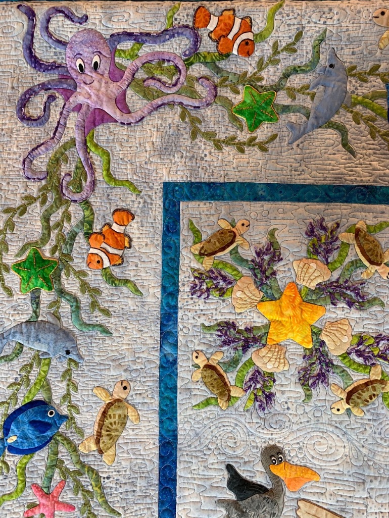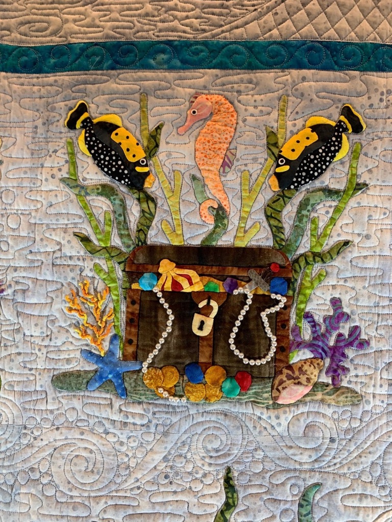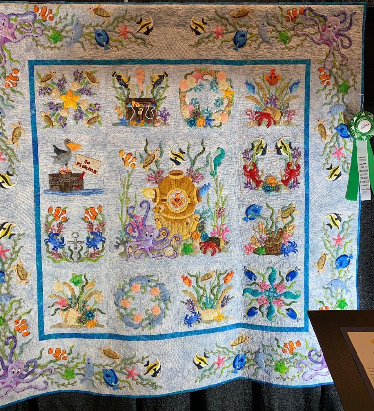 When you think of Baltimore Album quilts, you probably think of sailing ships, lighthouses, and flowers. This Baltimore Album takes you under the sea instead. Visit an Octopus Garden by Marilyn Hanson and quilted by Lorrie Ayala. This whimsical quilt featuring sea critters and treasure chests was on display in the Appliqué Wall category at Road to California 2020.