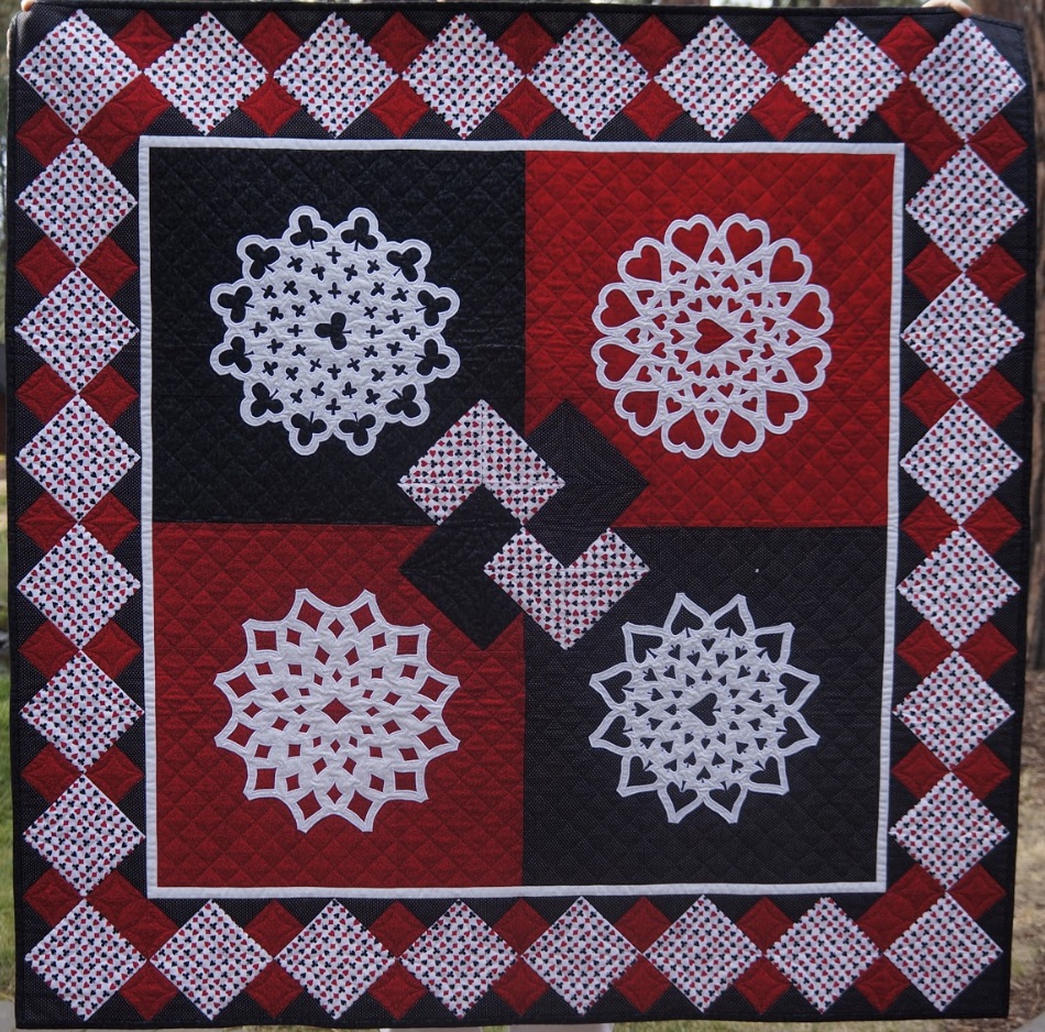 Kathy's King of Hearts quilt is based on a deck of cards. The four suits surround a Card Trick block. A pattern for this quilt can be found in Kathy's book, Sewflakes: Papercut-Appliqué Quilts.