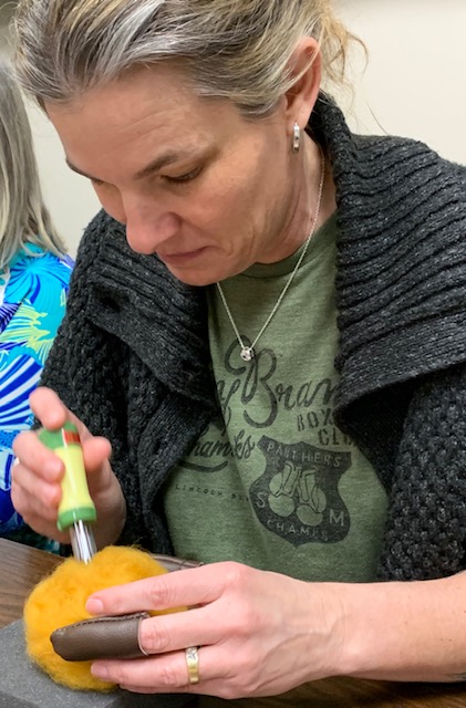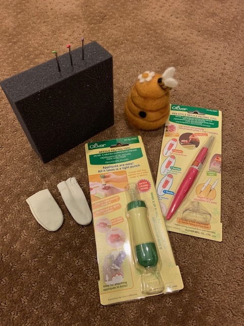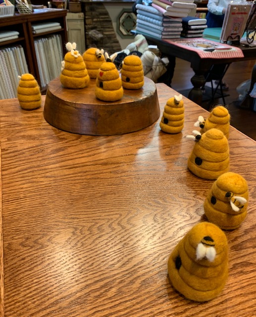 The one thing about the quilting world is that there is such a variety of things you can learn. And of course that would appeal to this old nurse because the career of nursing also offered a variety of specialties. Which means you are never bored! When the owner of The Olde World Quilt Shoppe, Monique, told me I had to come take a felting class because it was a Bee Hive...well, how could I say no!! I get to learn something new while visiting one of my top 5 quilt shops :) I had never felted anything on purpose and I was a bit leery that with these few tools I could create a Bee Hive.