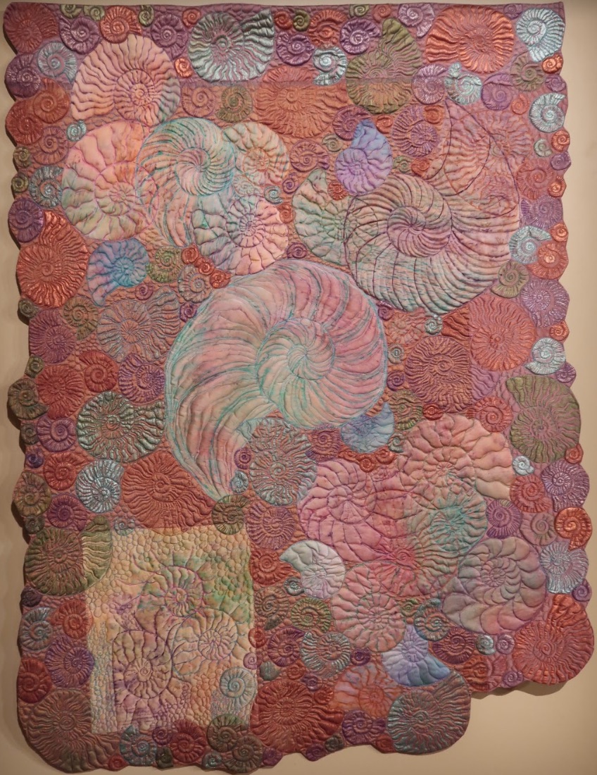 Ammonites are the extinct relatives of sea creatures, such as the modern Nautilus from Palau. That should give you some idea of what this interesting quilt by Kim Lacy is all about. How many do you think she has on this quilt?