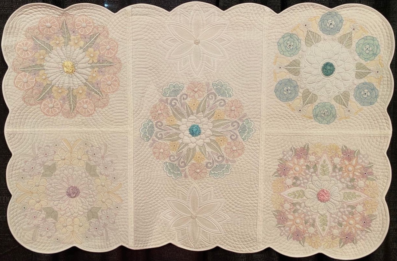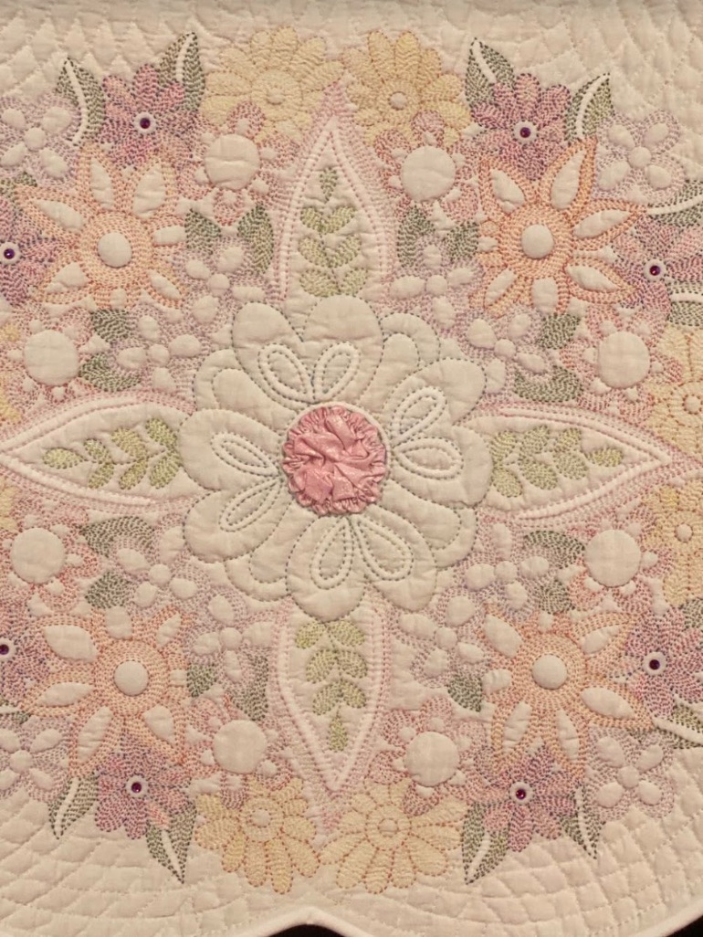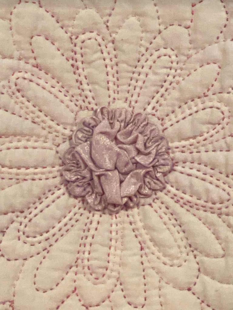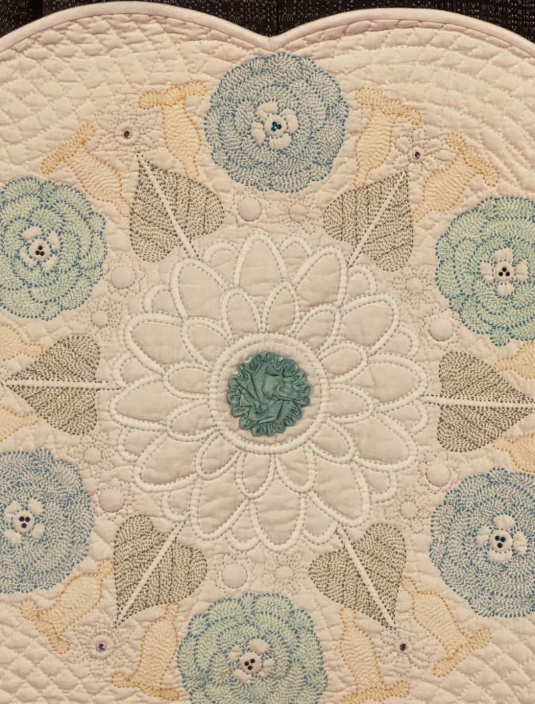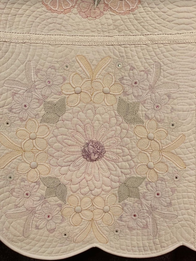 Joy of Spring by Jackie Perry of Marion, Virginia won Third Place, Merit Quilting, Hand, at the Houston International Quilt Festival 2019, and was inspired by an adult coloring book. Along with hand quilting, Jackie incorporated ruching and embellishments.