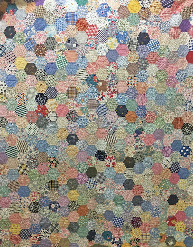 The family says that Theora loved her garden more than quilting, but she left behind a beautiful charm quilt made to keep her family warm. Typical of many quilts made at this time, this one employed a wide variety of scrap fabrics cut into large hexagon shapes.