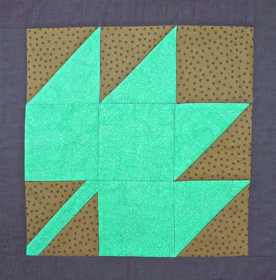 A typical traditional quilt block will feature a main pattern (such as the maple leaf pictured here) and the areas surrounding the pattern. Artists refer to the main subject (in this case the maple leaf) as “positive space” and the areas surrounding the main subject as “negative space” (in this case the background fabric). The balance between positive and negative space in quilt blocks varies. As you can see, more than half the space in this Maple Leaf block contains the leaf shape, clearly distinguished by the fabric selected. However, a quilt block like Log Cabin typically features only the strips of the log cabin pattern with no background fabric at all. In this case, the entire block is the subject. Traditional quilt blocks also tend to be symmetrical and are framed by a border fabric. This creates a visually stable design.