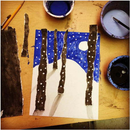 This winter tree landscape makes use of a simple idea, namely that torn paper looks a lot like the bark edges of a tree, but needs to be done neatly for maximum impact.