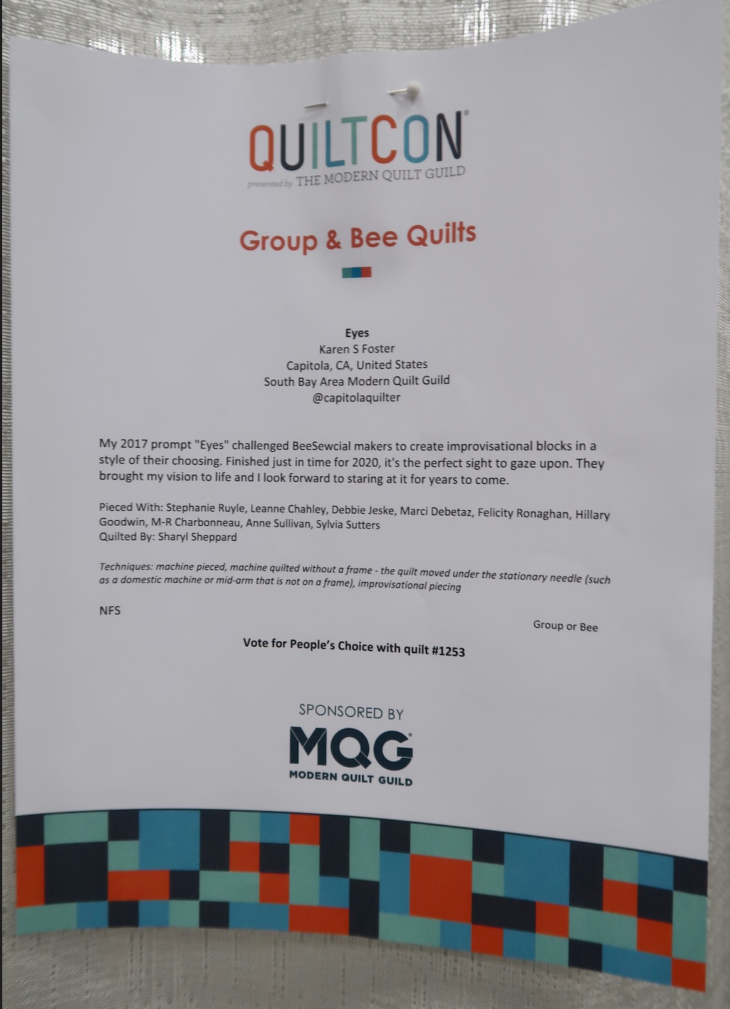 Eyes by Karen S. Foster and others (see sign below), of the South Bay Area Modern Quilt Guild, was featured in the Group & Bee Quilts category at QuiltCon 2020.